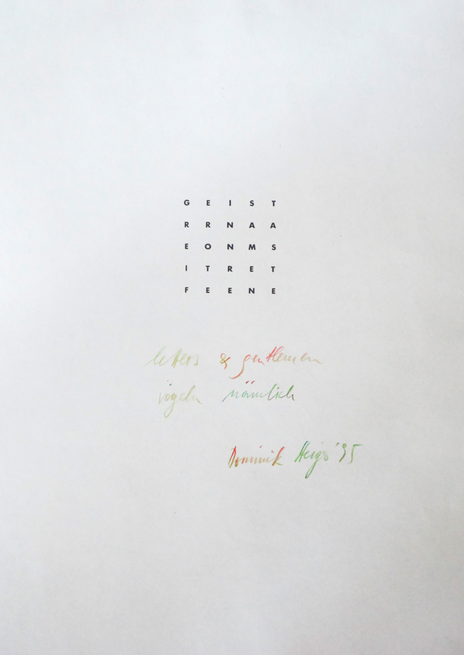 Eines von 24 Exemplaren (Gesamtauflage). Enthält vorwiegend Reproduktionen von Polaroids mit Abbildungen von Plastiken Installationen u. a. von Steiger zeigen. Das vorletzte Blatt mit einem "Geist"-Akrostichon mit einem Mehrfarbenstift von Steiger signiert, datiert (1995) und betitelt ("letters & getlemen vögeln nämlich". GEIST ist ein Teilanagramm des Namens des Künstlers (1940-2014). Die Buchstabenzusammensetzung des Wortes "Geist" hat strukturell nichts mit dem zu tun hat, was das Wort bezeichnet. "Steiger kommt - eine alte poetische Technik nützend, die als Unterart der Freud’schen Wortwitztechnik 'Verdichtung mit Ersatzbildung' gelten kann - zu einer Definition eines 'inneren Automaten' in Befehlsform. ... über 'LETTERS & GENTLEMEN VÖGELN' (schreibt Steiger): 'also nichts anderes als eine pikante Formel für längst Bekanntes, nämlich Prägung durch Eigenname, allgemeiner: psychische Determiniertheit durch Vokabular.' Der Prägung durch den 'Steig' des Namens wird mithilfe von Permutation zu 'Geist' entkommen, der Determiniertheit durch das Wort mithilfe des Akrostichons, denn die psychische Determiniertheit kommt ja durch nichts anderes zustande als durch Konvention, ein bestimmtes Wort auf einen bestimmten Gegenstand(sbereich) zu beziehen. Sieht man mit Mallarmé die poetischen Techniken (bei ihm steht für diese der vergöttlichte Vers, den Philosophen, die an logische Abbildungen glauben, genügt der Satz) als Versuch, den zufälligen Zusammenhang zwischen Wort bzw. Name und Gegenstand zu kompensieren, fällt auch die Umwidmung der Buchstaben des Wortes zu Anfangsbuchstaben darunter. Gesteht man dem autómaton dieser Zerlegung zu, dass aus ihm durch von Tabu und Kontrolle (des Wörterbuchs) befreite Assoziation Geist emergiert, der sich die Worte zu den Anfangsbuchstaben sucht, hat Steigers Reduktion von 'Geist' auf das, was er nicht ist und der Name nicht bedeutet, ihre Mission erfüllt. (Einen ähnlichen Ansatz hat Michel Leiris in seinem poetischen Wörterbuch sehr viel weiter verfolgt.) Nun scheinen die Assoziationen selbst wieder durch Freuds Theorie geleitet, und mit der metaphorischen Samentaste spielt Steiger auf Figurenbildung an, die nicht nur auf konkreter Zeichenebene semantisch abhängig ist." (vgl. www.dominiksteiger.at). – Tadellos.