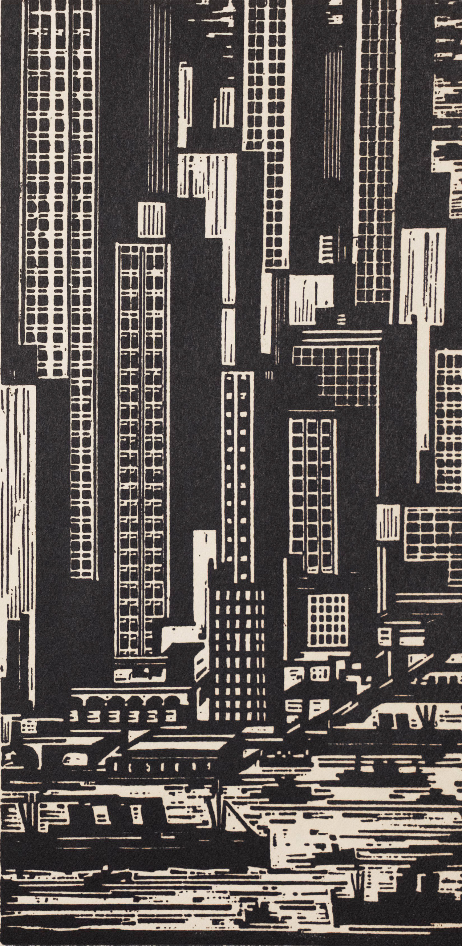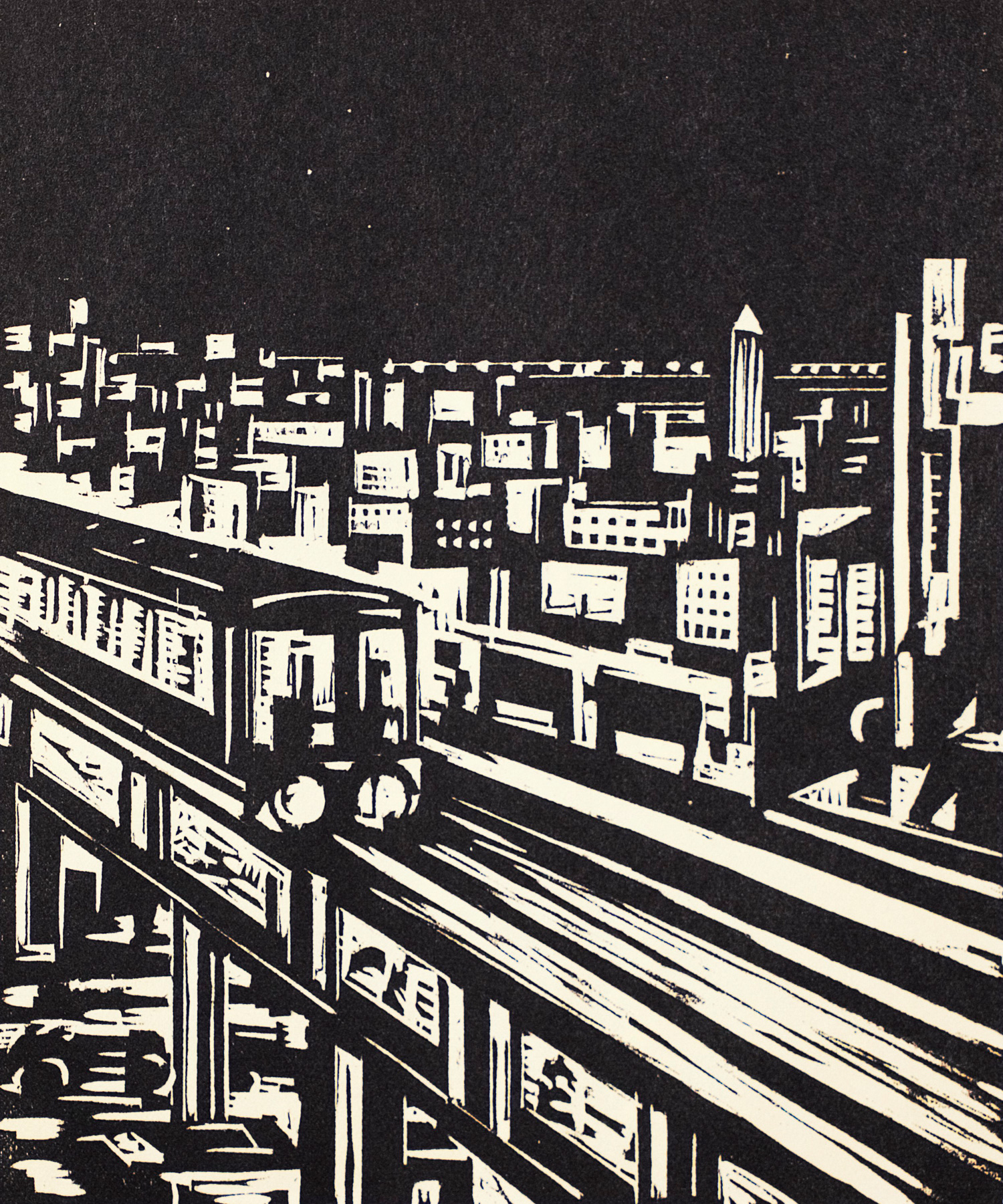 Thalmann, Max. Vom Rhythmus der neuen Welt. Amerika im Holzschnitt. 8 Bl. Mit 24 Original-Holzschnitttafeln. 29 x 22,5 cm. OHalbleinen (berieben, bestoßen, leicht fleckig und mit Fehlstellen) mit Rück- und DTitel. Jena, Eugen Diederichs, 1927.