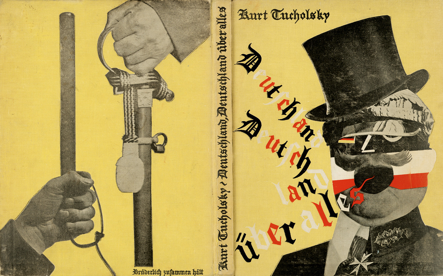 Tucholsky, Kurt. Deutschland, Deutschland ueber alles. Ein Bilderbuch. 21.-30. Tausend. 231 S., 2 Bl. Mit zahlreichen Fotomontagen von John Heartfield. 23,5 x 18 cm. Gelber OLeinenband (minimal berieben) mit Deckelmontage von John Heartfield. Berlin, Neuer Deutscher Verlag, (1929).