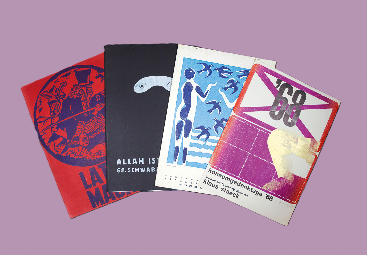 68. Schwabacher Druck. Vgl. Spindler 134. – Eines von 75 nummerierten Exemplaren (Gesamtauflage). – Wohlerhalten. – Dabei: Laterna magica III. Lyrik, Prosa, Graphik und Lieder aus dem Südgau. Herausgegeben von W. Eike Gellinek und Georg Forstmann. 14 mont. Bl. Mit 7 blattgroßen Graphiken. 42 x 30 cm. Illustr. OBroschur. Erlangen 1967. - Eines von 150 nummerierten Exemplaren (Gesamtauflage). - (Kalender mit 12 signierten Originalgraphiken). 12 Bl. 42 x 29,5 cm. Kalenderheftung. O. O. 1990er Jahre. - Mit sign. Originalholzschnitten von Lüdicke, v. Gosen, Lederer, Neufeld u. a. - Etwas stockfleckig. - Klaus Staeck. Konsumgedenktage '68. Kalender mit 9 (inkl. Umschlag; statt 13) signierten Originalsiebdrucken von K. Staeck. 41,5 x 29 cm. Kalenderheftung (defekt). München, Junge Akademie, 1967. - Eines von 500 nummerierten, von Staeck signierten, Exemplaren.