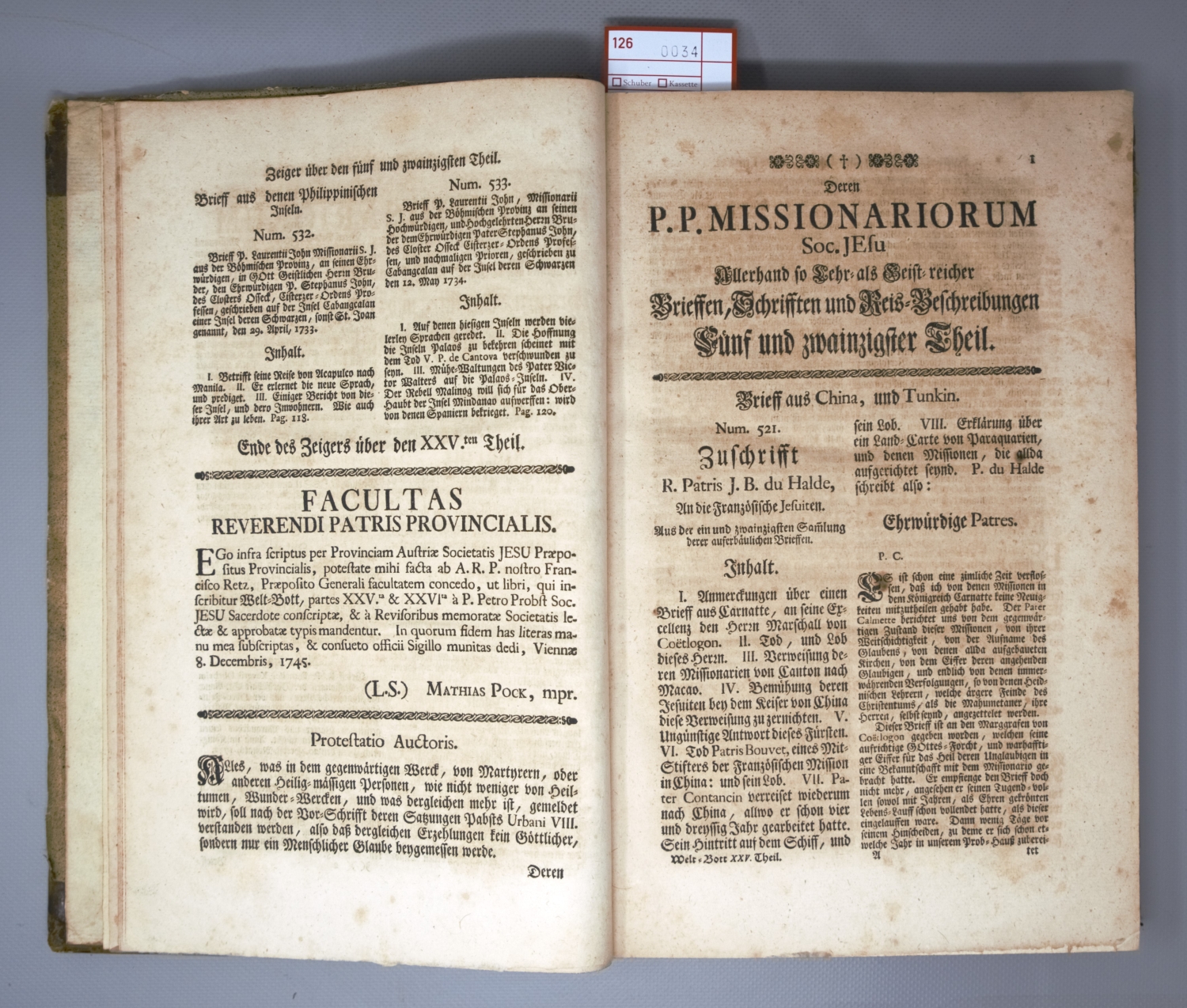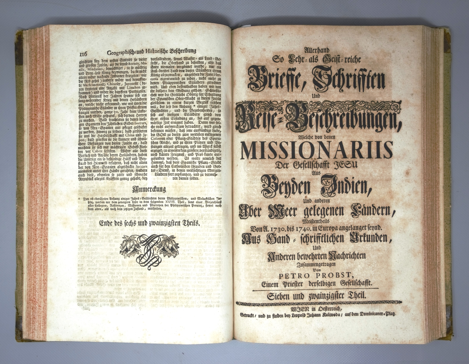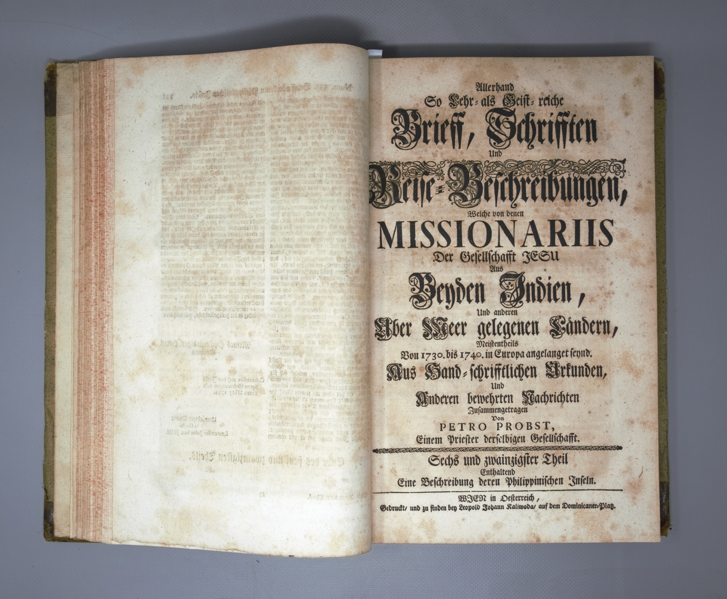 Allerhand so lehr- als geistreiche Brief, Schriften und Reise-Beschreibungen, welche von denen Missionariis der Gesellschaft Jesu aus beyden Indien, und andern über Meer gelegenen Ländern, meistentheils von A. 1730 bis 1740 in Europa angelangt seynd. Aus hand-schriftlichen Urkunden, und anderen bewerthen Nachrichten zusammengetragen von Petro Probst. Band IV, Teile XXV bis XXVIII. 4 Teile in 1 Band. Haupttitel in Schwarz und Rot. Mit 3 gefalteten Kupferstichkarten. 34 x 21,5 cm. Halbleder d. Z. (etwas stärker fleckig, berieben und bestoßen) mit 2 goldgeprägten RSchildern. Wien, Leopold Johann Kaliwoda, 1748.