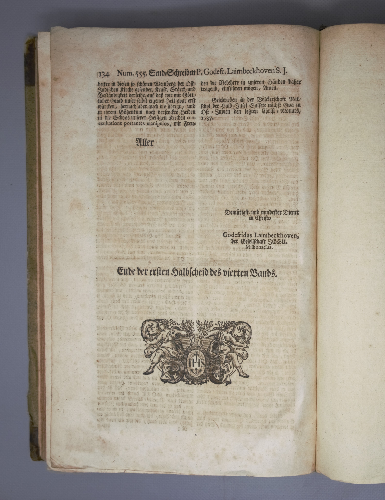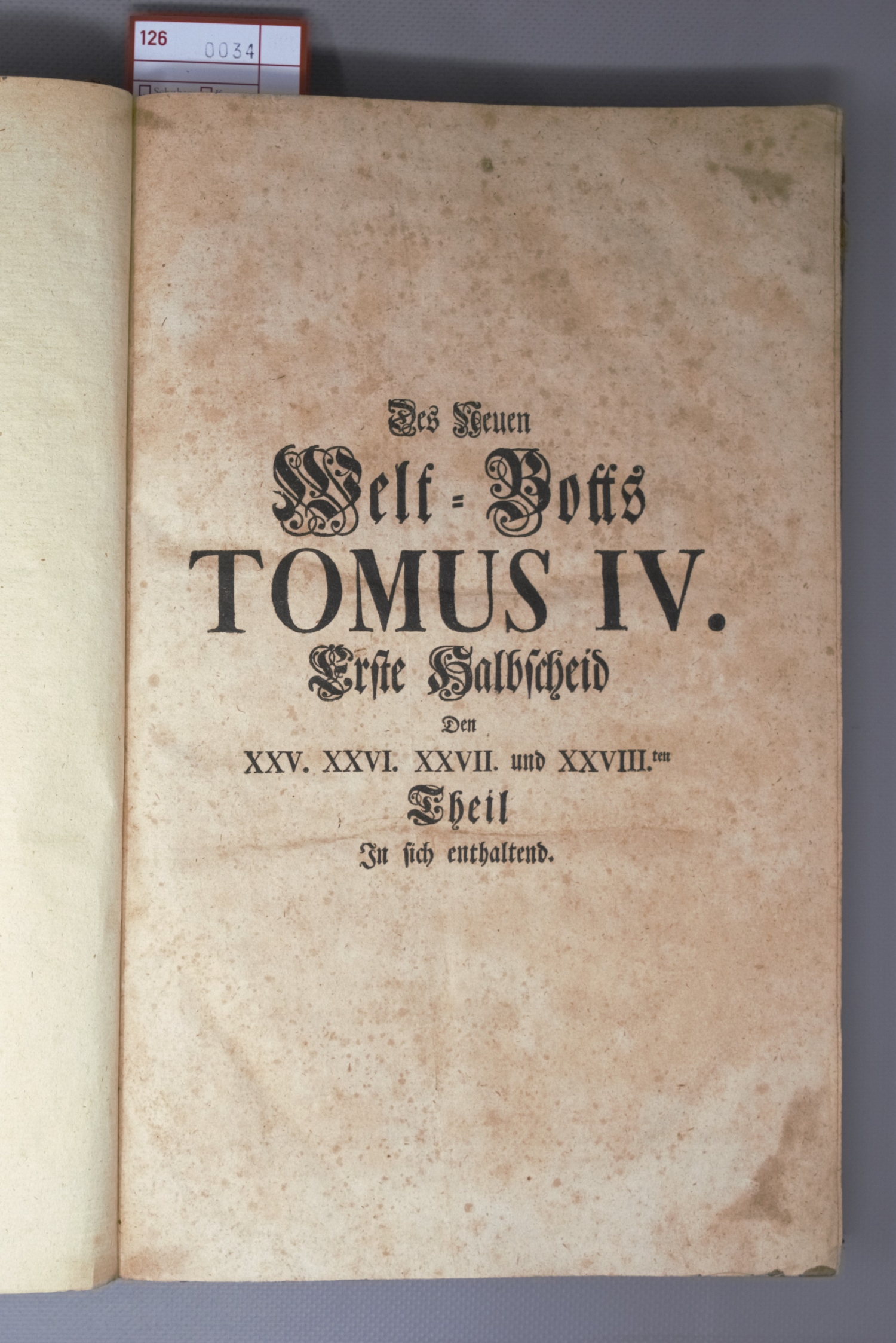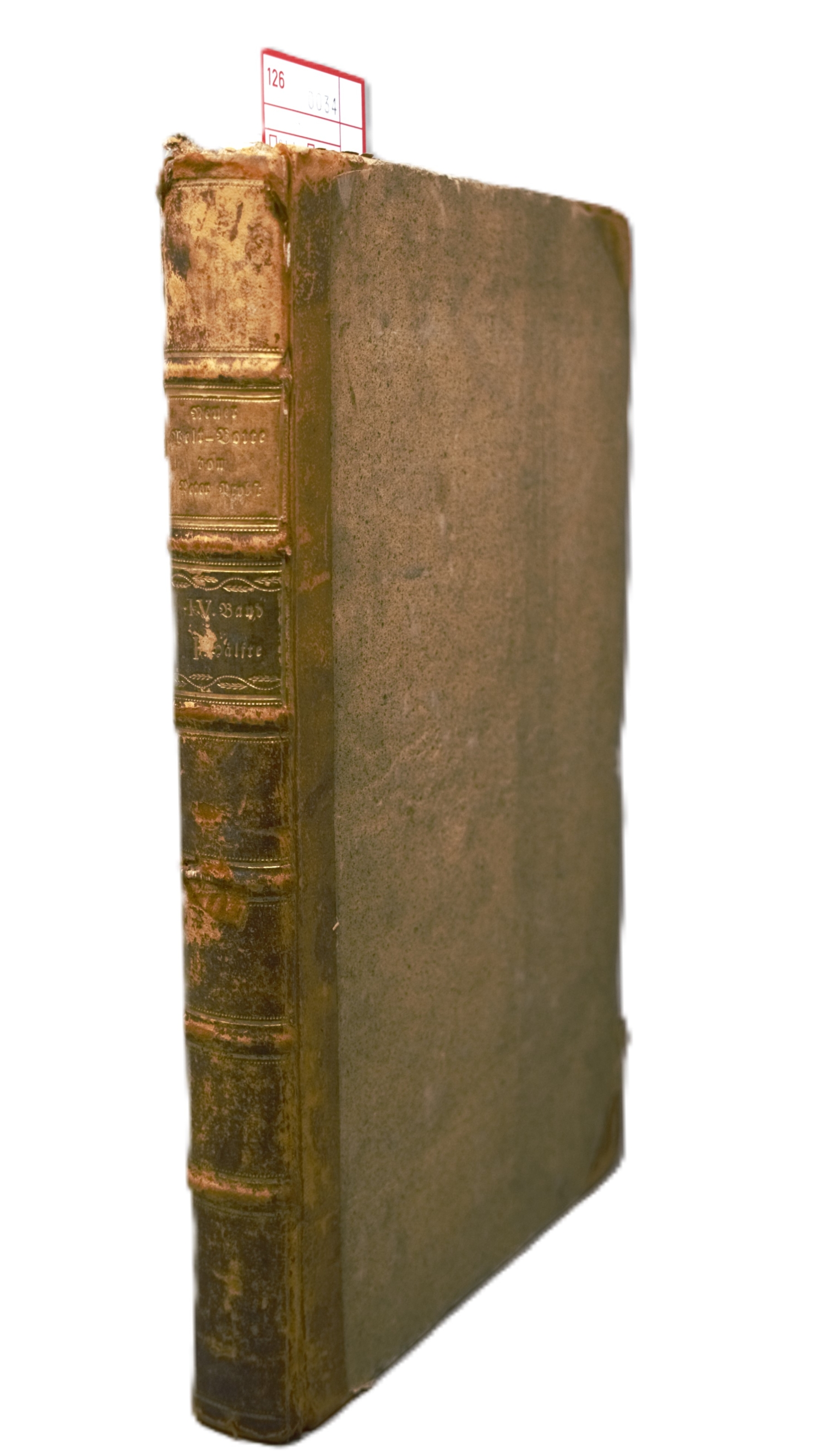 Allerhand so lehr- als geistreiche Brief, Schriften und Reise-Beschreibungen, welche von denen Missionariis der Gesellschaft Jesu aus beyden Indien, und andern über Meer gelegenen Ländern, meistentheils von A. 1730 bis 1740 in Europa angelangt seynd. Aus hand-schriftlichen Urkunden, und anderen bewerthen Nachrichten zusammengetragen von Petro Probst. Band IV, Teile XXV bis XXVIII. 4 Teile in 1 Band. Haupttitel in Schwarz und Rot. Mit 3 gefalteten Kupferstichkarten. 34 x 21,5 cm. Halbleder d. Z. (etwas stärker fleckig, berieben und bestoßen) mit 2 goldgeprägten RSchildern. Wien, Leopold Johann Kaliwoda, 1748.