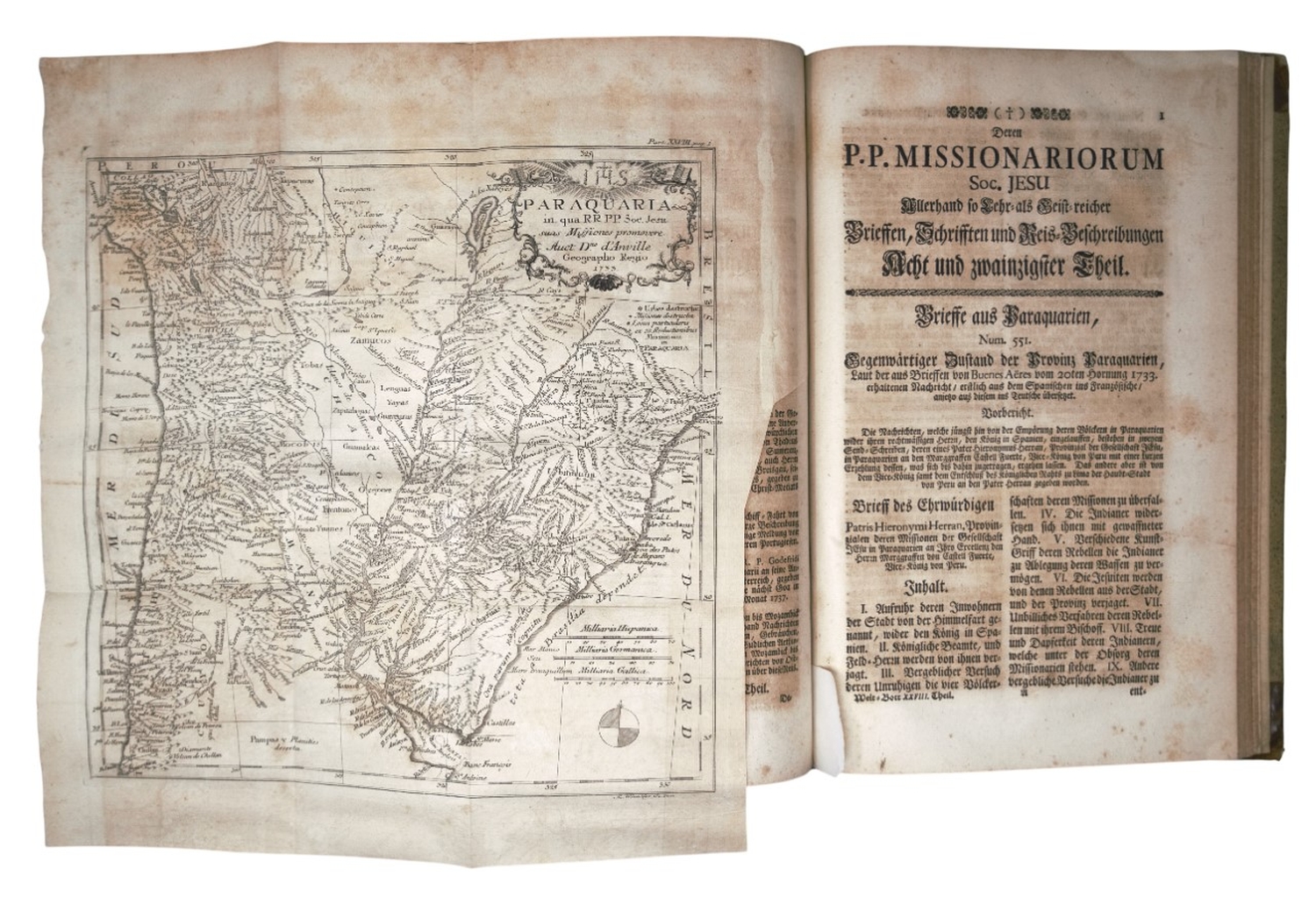 Der neue Welt-Bott Tomus IV. Streit I, 838. De Backer-Sommervogel VII, 1586. Sabin 91981. Palau 322.590. Cordier, BS 941f. – In sich geschlossener Band IV der von 1726 bis 1761 in insgesamt 38 Teilen erschienenen und von Josef Stöcklein herausgegebenen Sammlung von Berichten über Reisen und Missionsgründungen der Jesuiten in Amerika, Asien und Afrika, auch als "Welt-Bott" bekannt, zugleich eine der bedeutendsten Quelle der Missionsgeschichte des 18. Jahrhunderts. "Der Wert dieser Sammlung besteht darin, daß Stöcklein eine große Anzahl von Briefen veröffentlicht, die von deutschen Missionaren stammen" (Streit). Die drei Faltkarten zeigen die Philippinen, Paraguay und Afrika. – Etwas braunfleckig, sonst wohlerhalten.