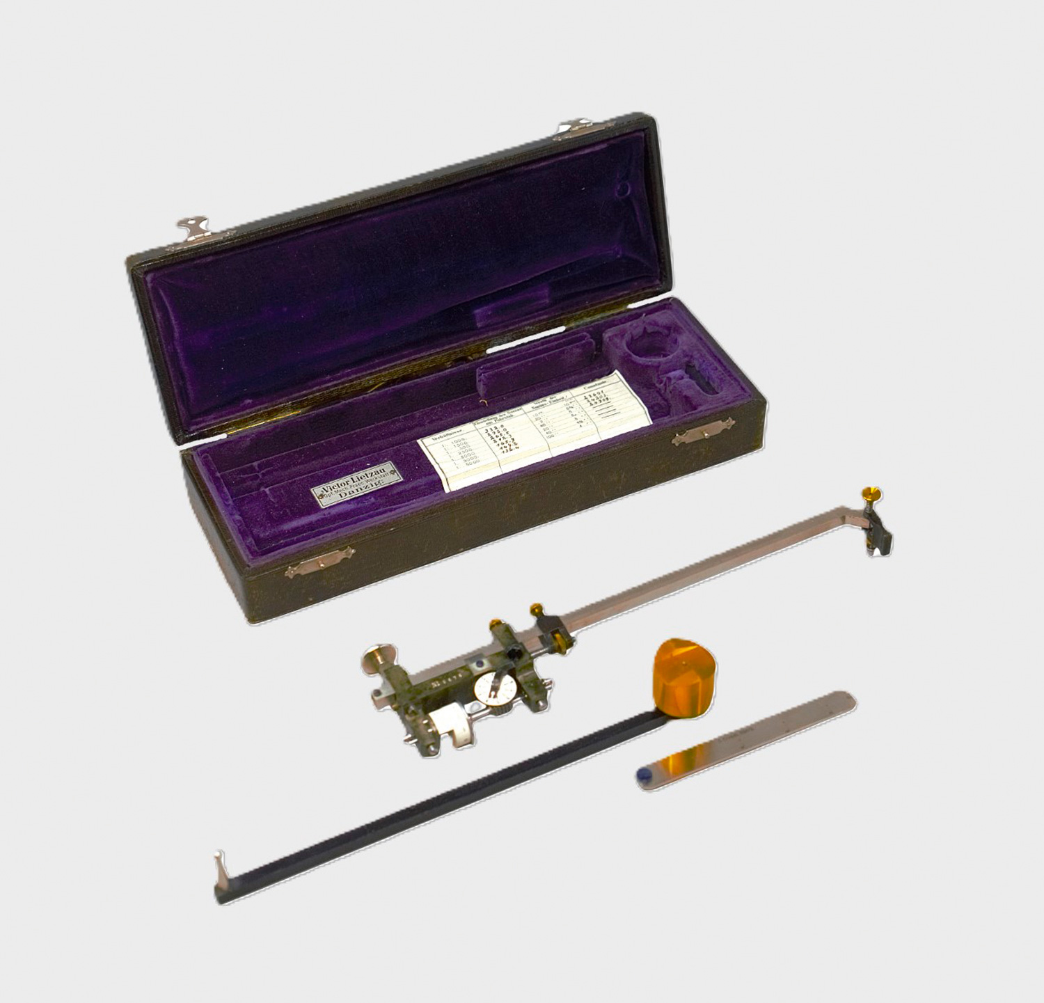 Planimeter. Messgerät zur Ermittlung von Flächeninhalten auf Landkarten. Edelstahlinstrument mit Messingelementen, ein Gestängearm graviert mit "G. Coradi Zürich". Länge: 23 cm. Im Original-Lederetui (diese berieben und bestoßen) mit Klappdeckel und zwei Metallschließen, innen mit violettem Samt ausgekleidet. 9 x 25 x 4,5 cm. Danzig, Werkstatt Victor Lietzau, um 1906.