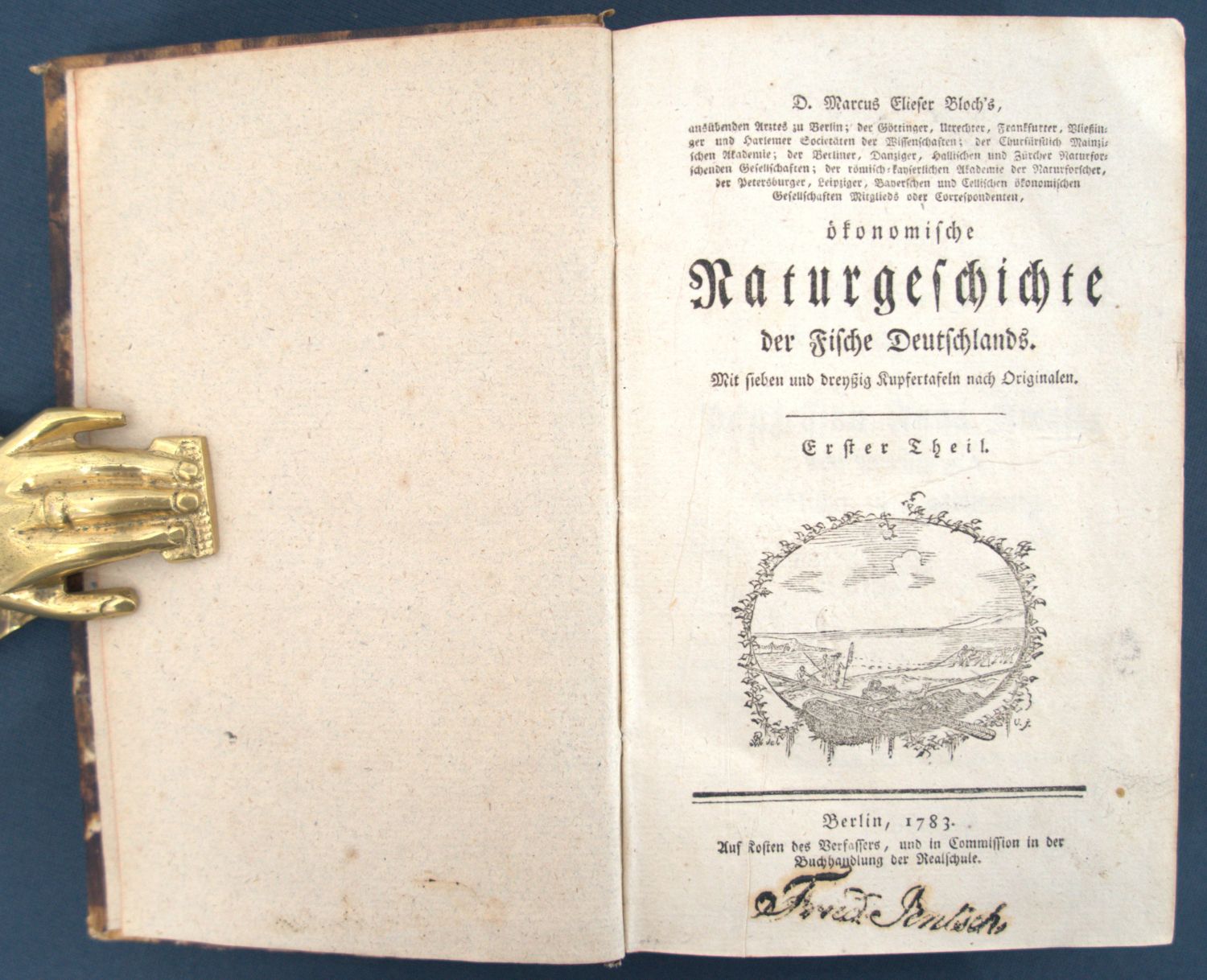 Nissen ZBI 415. – Erste Ausgabe des berühmten Werkes in der Oktav-Ausgabe. "Das ichthyolog. Hauptwerk des vorigen Jahrhunderts, welches ... die heimischen Fische ausgezeichnet charakterisiert" (ADB II 708). Die dekorativen Tafeln in frischem, zeitgenössischen Kolorit nach Zeichnungen von Joh. Aug. Krüger jun., gestoch. von Bodenehr und A. F. Schmidt. – Vorsätze mit Besitzvermerk ("Betin aJentsch Brochotschine 1900"), Titel im weißen unteren Rand mit altem Stempel in Kurrentschrift ("Fried. Jentsch"); teils etwas gebräunt und vereinzelt braunfleckig; insgesamt wohlerhaltenes und schönes Exemplar. Bloch wurde 1723 in Ansbach geboren. Er war Arzt in Berlin und starb 1799 in Karlsbad.