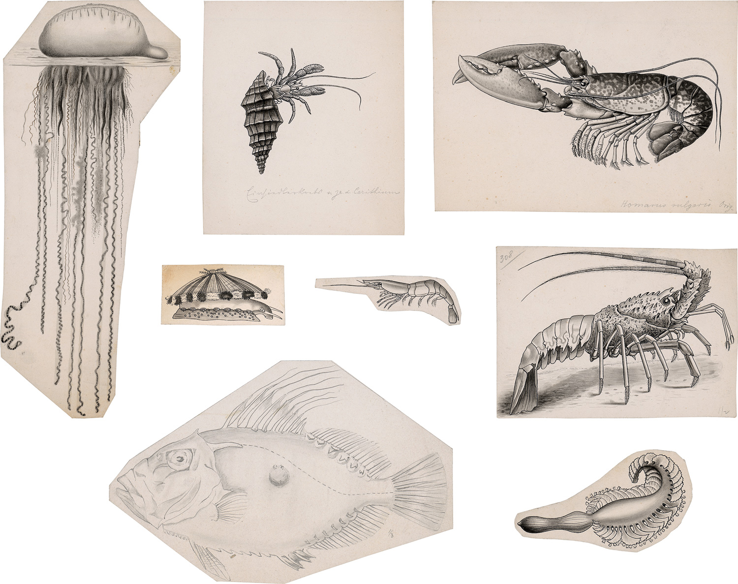 Zeichnerischer Teilnachlass des österreichischen Zoologen und Hochschullehrers Carl Isidor Cori (1865-1954), wohl Vorarbeiten und Studien zu verschiedenen Publikationen aus seinen Forschungsgebieten Meeresbiologie und Anatomie der Wirbellosen. "Als Arbeitsgebiet wählte (Cori) die vergleichende Anatomie der Wirbellosen, speziell von Gruppen mit problematischer Stellung im System und in der Phylogenie, wie die Kamptozoa und Phoronidea. Seine späteren Monographien dieser Gruppen in verschiedenen Sammelwerken sind reich an neuen Ergebnissen. Unter Ernennung zum außerordentlichen Professor übernahm er 1898 die Leitung der zoologischen Station in Triest, die er in der Folge, nicht zuletzt durch die von ihm eingerichteten meeresbiologischen Ferialkurse, die Gäste aus aller Welt anlockten, zu einem Institut von internationalem Ruf ausbaute. Als Initiator und Organisator erwarb sich Cori große Verdienste um die Adriaforschung" (NDB III, 360). Die rund 160 vorhandenen, teils überaus akkurat ausgeführten Orig.-Feder- und Bleistiftzeichnungen sind zumeist aus Kartonblättern herausgeschnitten oder sauber montiert und zeigen zahlreiche Darstellungen von Meeresbewohnern wie Krebse, Schnecken, Fische, Quallen, Algen etc. Ferner vorhanden ist eine Folge von sechs Papptafeln mit weiteren 80 Orig.-Zeichnungen mit anatomischen Details, die wohl als Druckvorlage dienten, sowie eine Fülle von weiteren Bleistiftzeichnungen mit Entwürfen und Skizzen auf dünnem Papier und teils erläuterndem Text, zumeist in beschrifteten Papierumschlägen. Beiliegend ein eigenhändiger zweiseitiger Brief seines Sohnes Carl Ferdinand Cori (1896-1984), Pharmakologe und Nobelpreisträger, an seine Schwester Margarete, verheiratete Mainx (1905-2000) zum Tod des Vaters am 31. August 1954. Datiert Seal Harbor, Maine den 3. September 1954. Auf Briefpapier der Washington University Saint Louis und in frankiertem Briefumschlag.