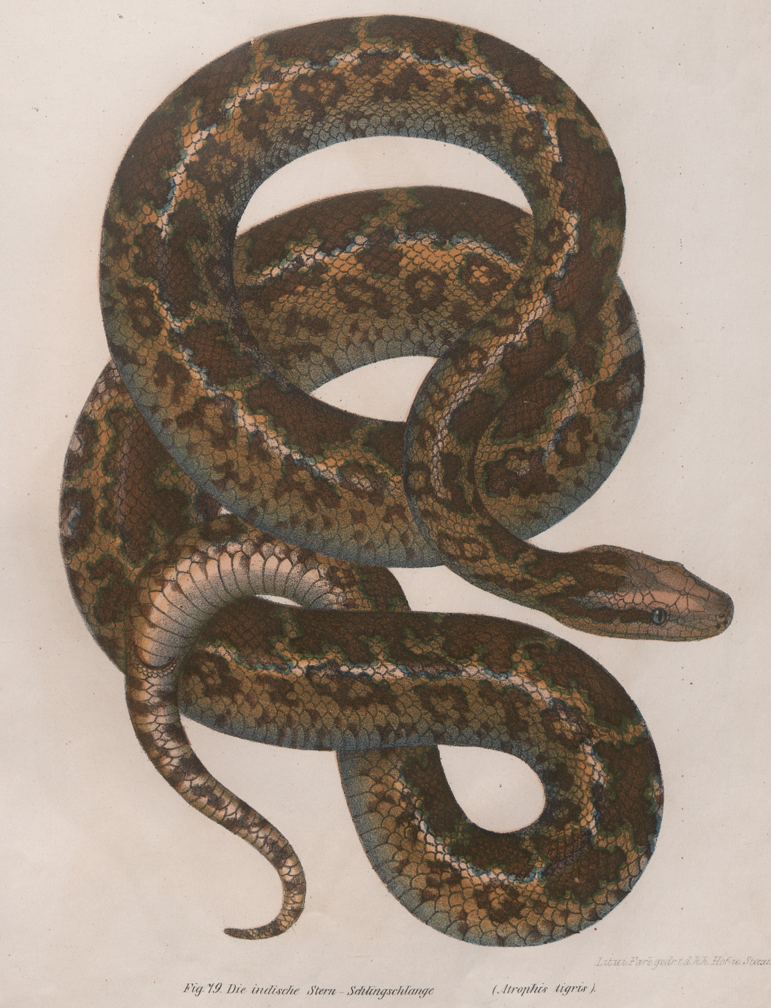 Nissen 1390a. – Erste Ausgabe aus einer Reihe von Werken mit ähnlichem Titel zu verschiedenen zoologischen Gebieten, wie Säugetiere, Vögel, Fische, Amphibien und Wirbeltiere. Der österreichische Zoologe Leopold Joseph Franz Johann Fitzinger (1802-1884) war Leiter der Reptilien- und Säugetiersammlungen im Wiener Naturhistorischen Museum und Direktor des damals neu zu errichtenden Zoos im Englischen Garten München. – Titel mit Feuchtflecken, etwas fleckig und mit hs. Besitzvermerkten und Besitzstempel "K. K. Staatsmittelschule in Reichenberg", letzter wiederholt sich verso auf allen Tafeln. Insgesamt etwas fingerfleckig und vereinzelt.