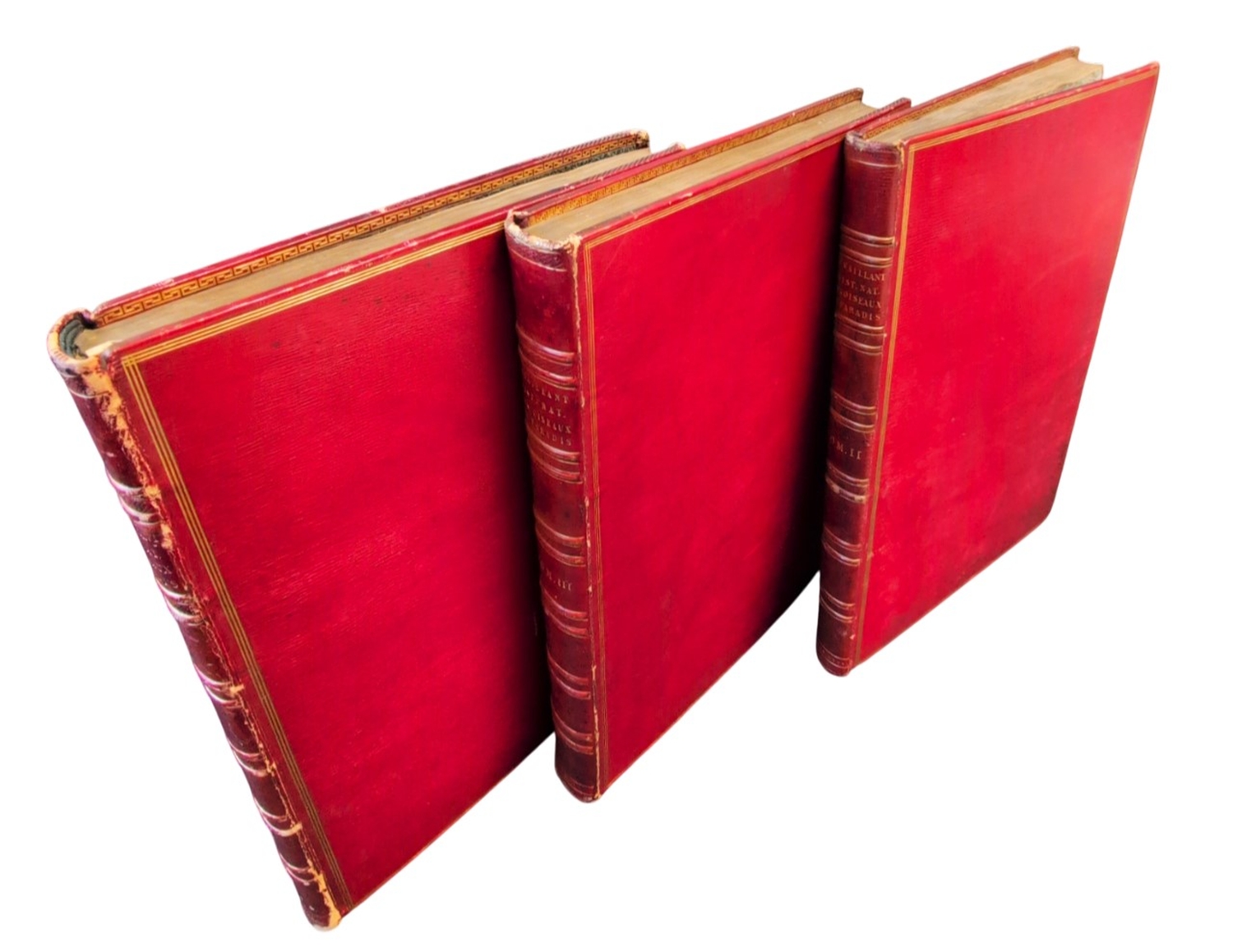 Kollation: Band I: 2 nn. Blätter (Vortitel, Titel), 155, 11 S. (Table). - Band II: 2 nn. Bl. (Vortitel, Titel), S. 1-34, 41-48 (recte: 35-42), 43-106, 109-(112) (recte: 43-110), 111-133, 11 S. (Table), 1 nn. Bl. (Errata). Band III: 2 nn. Bl. (Vortitel, Titel), 81, 67, 52 S., 1 nicht numeriertes Bl. (Table). – Nur stellenweise minimal, unwesentlich gebräut und vereinzelt papierbedingt stockfleckig, liegt hier ein geradezu fürstliches Exemplar vor, dessen Tafeln von kundigen Kolorationskünstlern besonders minutiös und in überaus leuchtenden, ebenso dekorativen wie naturgetreuen Farben, teils unter Zuhilfenahme von Eiweishöhungen gestaltet wurde. Gebunden in grandiose Meistereinbände aus leuchtend rotem Maroquin in Chagrinmanier, stammt das Exemplar aus der Sammlung der Beriah Botfield, Marquess of Bath (vgl. die Longleat House Sale, Sotheby's, 11.6.79, Nr. 101, mit Abbildung der Einbände auf dem farbigen Frontispiz).