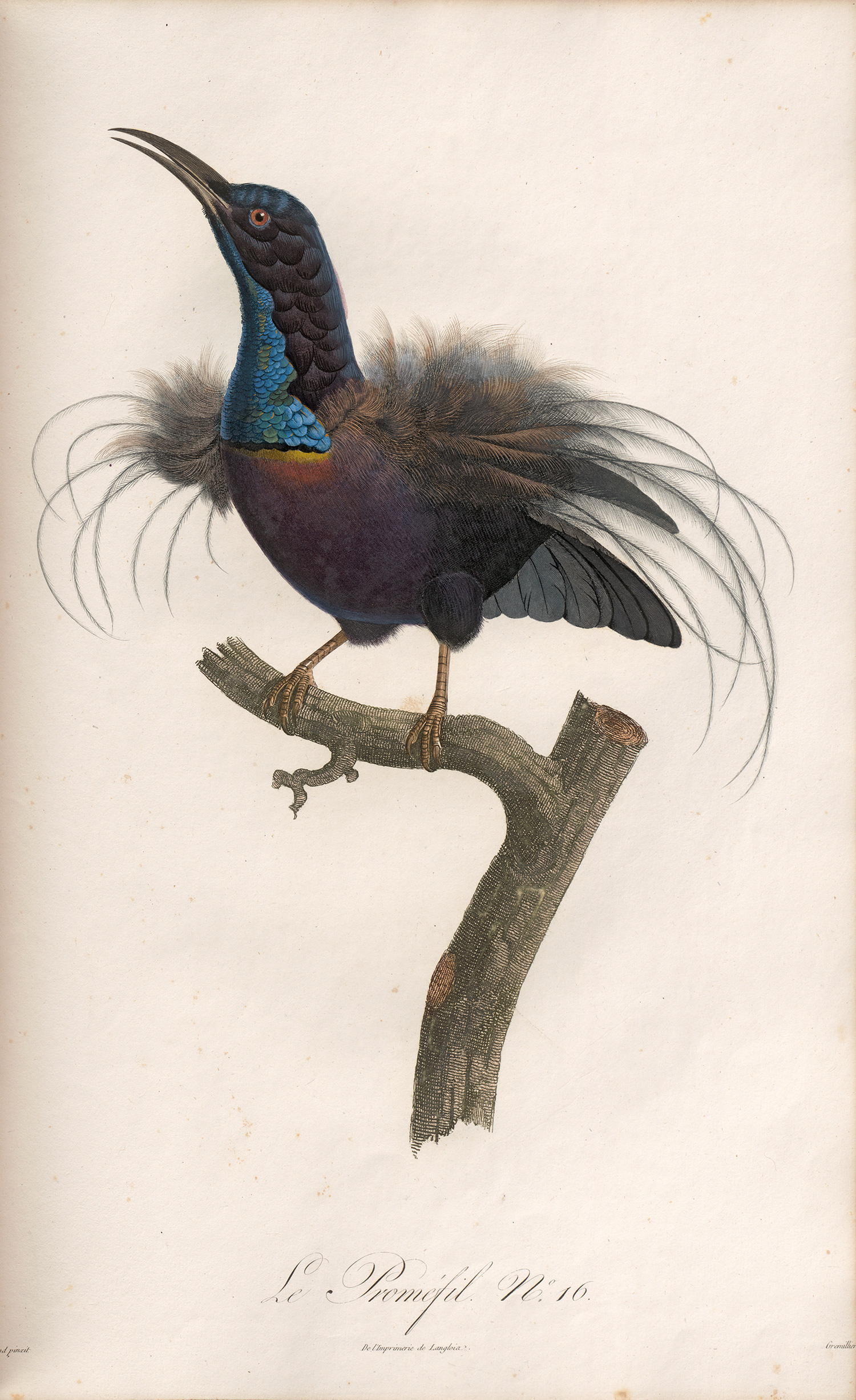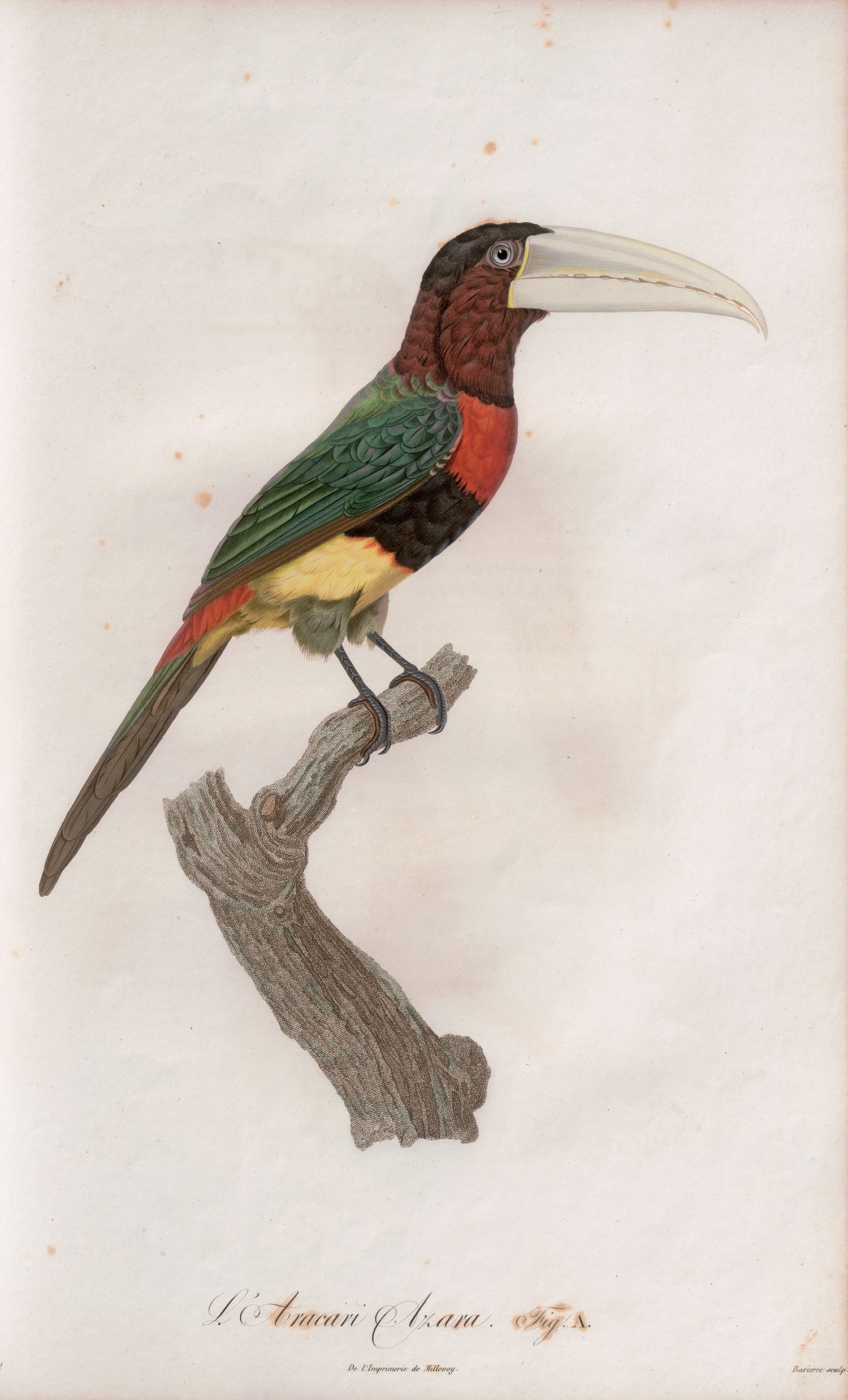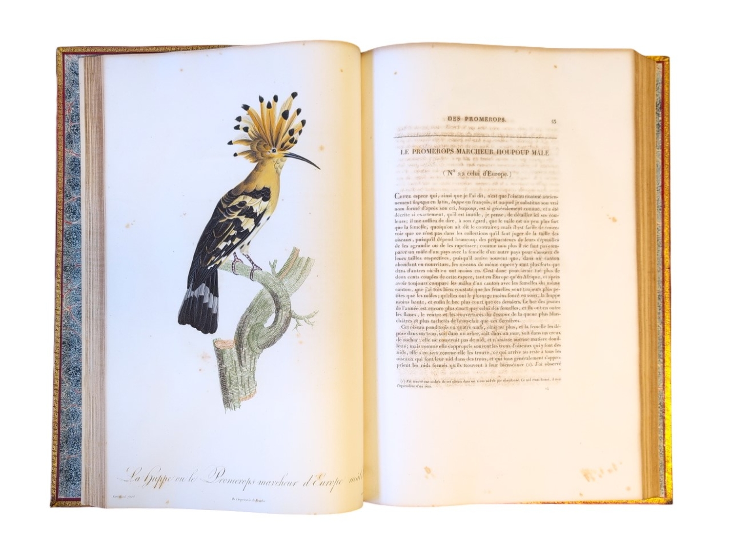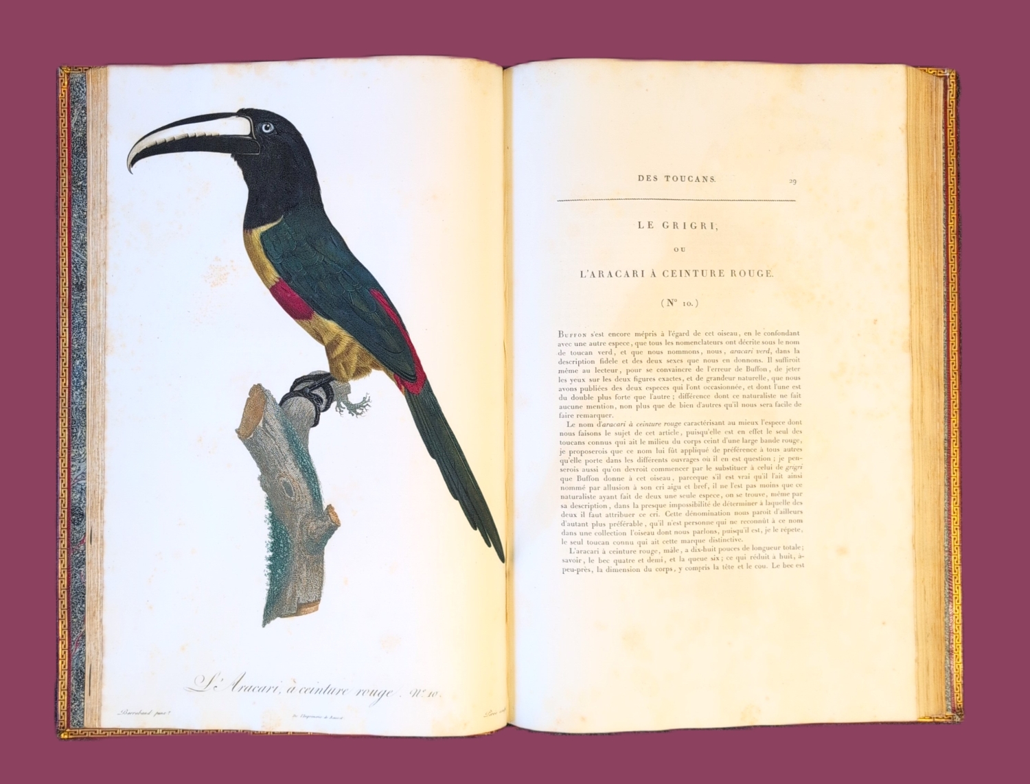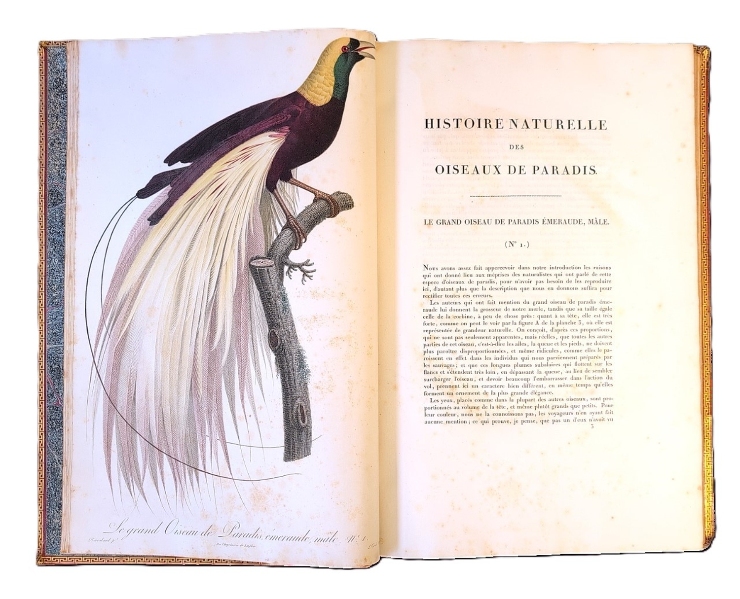 Nissen, IVB, 559 und 560. Anker 304 und 305. Zimmer, Ayer Library S. 393 (nur Bd. I-II). Sitwell-Buchanan-Fisher, Fine Bird Books, S. 119. Ripley-Yale S. 170. H. Bradley Martin Library 144. Ronsil 1780. David Lank, Nature Classics, 1987, S. 45. – Außergewöhnlich schönes Prachtexemplar der "Naturgeschichte der Paradiesvögel, Blauracke, Tukane und Bartvögel", ferner der "Honigvögel und Bienenfresser" (so die Titel), alles exotischer, überaus buntgefiederter Vögel der Tropen und südlichen Gefilde der Erde, herausgegeben von dem Ornithologen und Forschungsreisenden François Levaillant (1753-1824). Gebürtig in Paramaribo, der damaligen Hauptstadt von Niederländisch-Guayana, dem heutigen Surinam, erforschte Levaillant vor allem die Vögel der Kapregionen Afrikas ("Histoire naturelle des oiseaux d’Afrique", 1796-1808 in 6 Bänden). In den Jahren 1801 bis 1818 veröffentlichte er dann nach den Zeichnungen des begabten Malers und Illustrators Jacques Barraband (1768-1809) das vorliegende zweibändige Monumentalwerk, zu dem noch der hier ebenfalls vorliegende Ergänzungsband mit eigenem Titelblatt gehört. Später erschien das Werk unter dem gemeinsamen Haupttitel "Histoire naturelle des oiseaux de paradis".