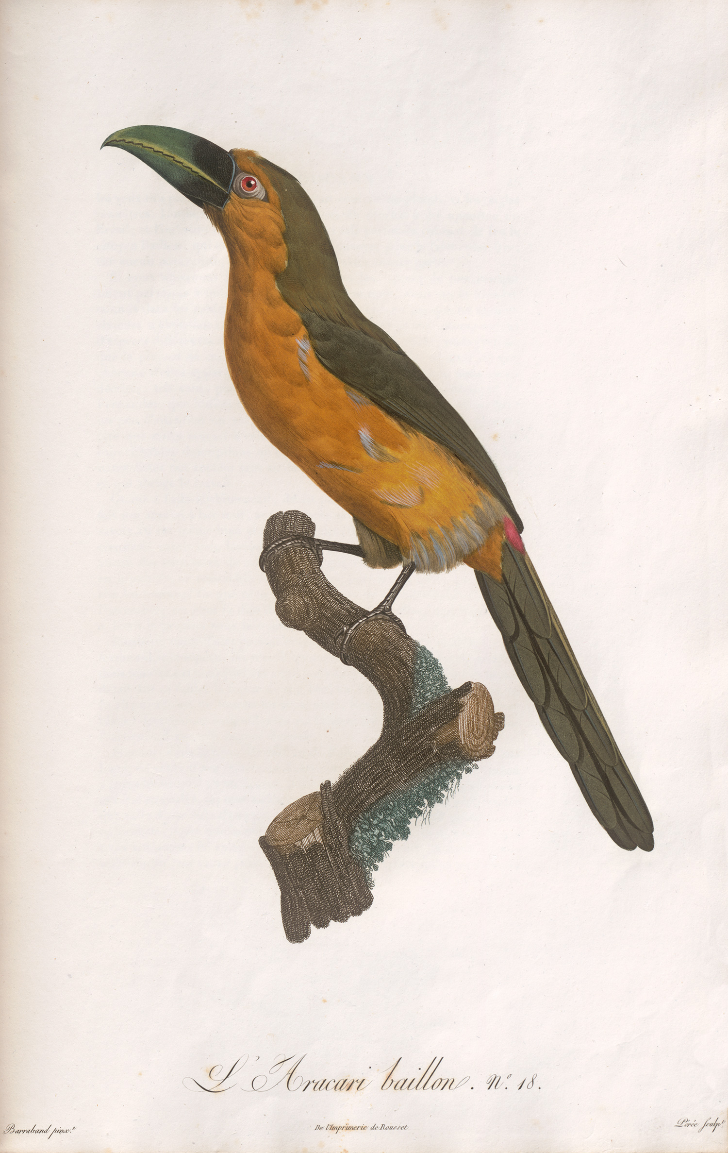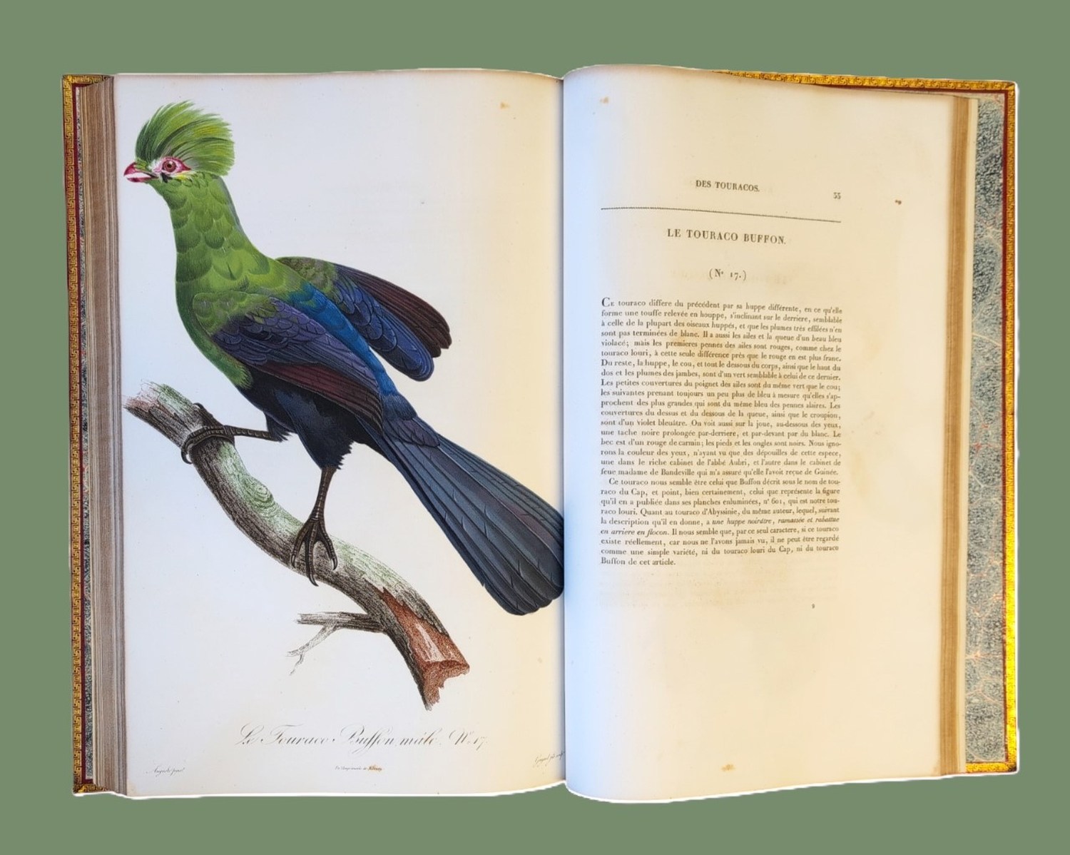Die insgesamt 197 Kupfertafeln (die größte mißt ca. 81 x 51,4 cm!) stammen hauptsächlich von dem wohl bedeutendsten Vogelmaler der Zeit Jacques Barraband, der auch für die Porzellanmanufaktur von Sèvres und die Gobelinmanufaktur als Zeichner tätig war und 1807 als Professor der Blumenmalerei nach Lyon ging. Barraband war es auch, der die Dekorationen füir Napoleons Speisezimmer im Château St. Cloud schuf. Das Werk ist, zusammen mit den "Perroquets" des Verfassers, einer der Höhepunkte des französischen Farbstichs der Napoleonischen Ära, in der die Publikation von Prachtwerken der Ornithologie und Botanik durch das Herrscherhaus gefordert wurde, die als repräsentative Geschenke für gekrönte Häupter und wissenschaftliche Institutionen dienten. Über ca. 18 Jahre hinweg erschien das Werk in Lieferungen, was einige Ungenauigkeiten in der Kollation und der Tafelzählung erklärt. Das vorliegende Exemplar stimmt jedenfalls mit der bei Anker gegebenen Kollation überein.