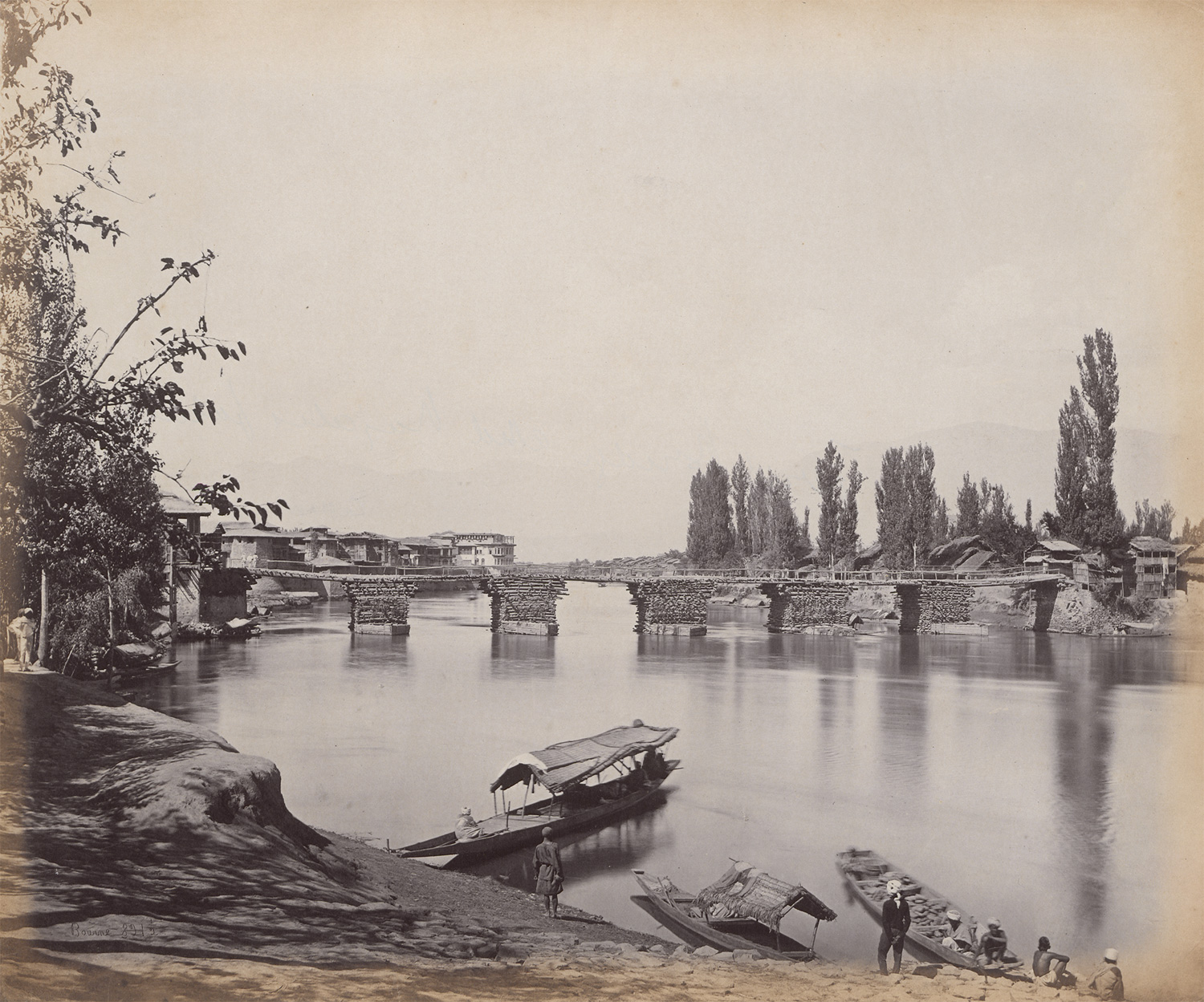 This group of ten photographs offers a representative selection of Samuel Bourne’s celebrated views from across North India, produced during his extensive travels for the firm Bourne & Shepherd. The images include architectural landmarks such as the Qutb Minar and Kashmir Gate in Delhi, the Residency in Lucknow, and Mughal tombs near Agra. Also featured are sweeping landscapes from Srinagar, the foothills of the Himalayas, and views along the rivers of Kashmir. Characterised by Bourne’s finely balanced compositions and clarity of tone, the prints reflect both documentary precision and an aesthetic sensitivity that contributed to his reputation as one of the foremost photographers of British India. – Some smudge/scuff marks, handling creases and fading, especially around the edges; mounts slightly worn, with some foxing, time-stained in edges. Overall in good to very good condition.