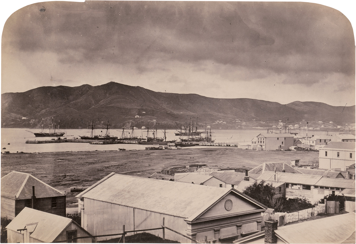 These early views of New Zealand include cityscapes of Auckland and the harbor of Wellington, alpine and glacial landscapes, as well as a rare early panorama of Nelson. Among the more unusual subjects is a photograph depicting the consulate building of the “Freie und Hansestadt Hamburg” on Queen Street in Auckland.