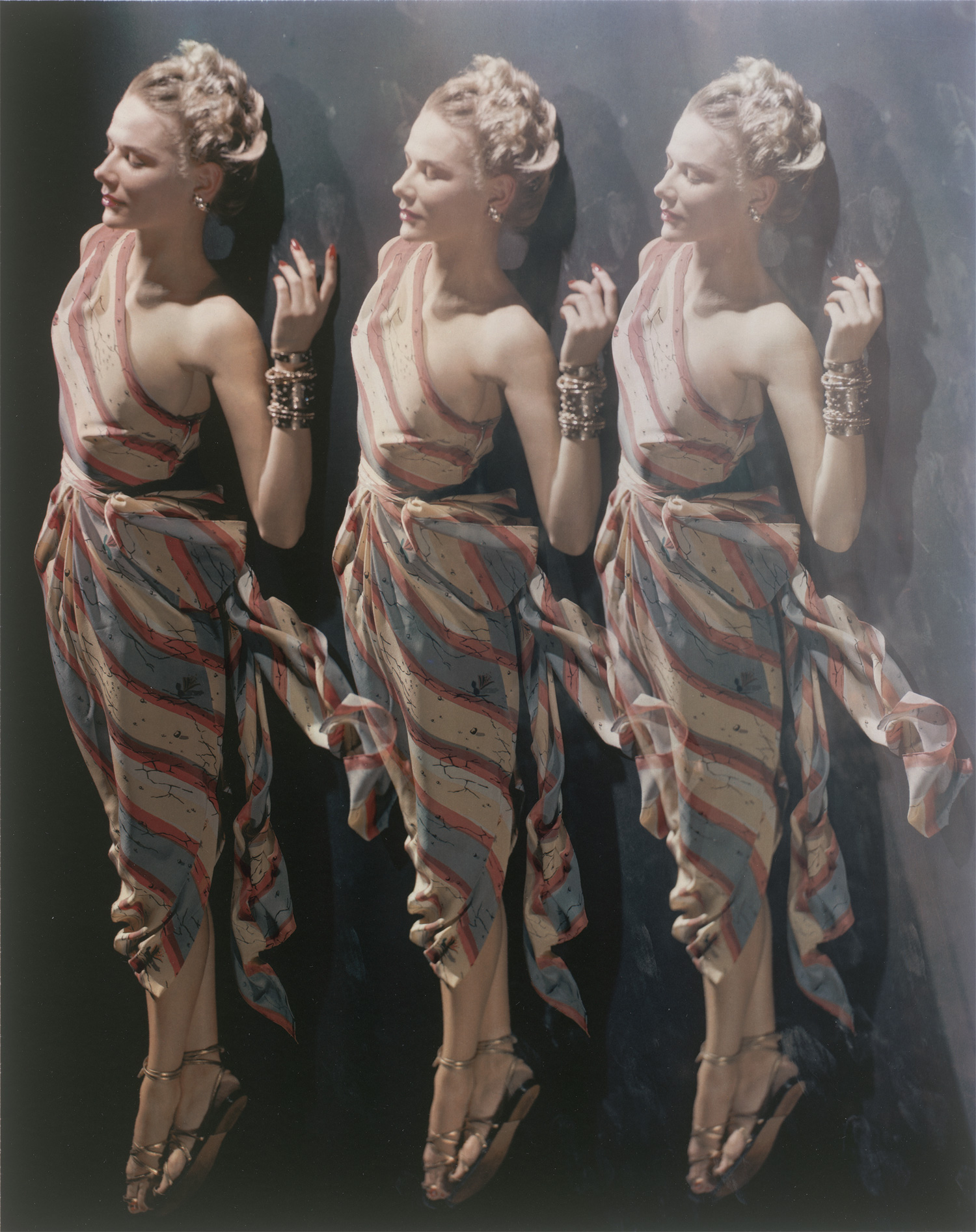 Blumenfeld Color. 1940-1950. 10 dye transfer prints, printed 1984. Each between 30 x 20 cm and 32 x 26 cm (sheet size 47 x 39,5 cm). Each with estate stamp, signed by F.C. Gundlach in pencil and numbered "27/50" on verso. Includes double sheet with title, table of contents, and imprint. Edition PPS Galerie F.C. Gundlach Hamburg. Presented in red linen clamshell box.
