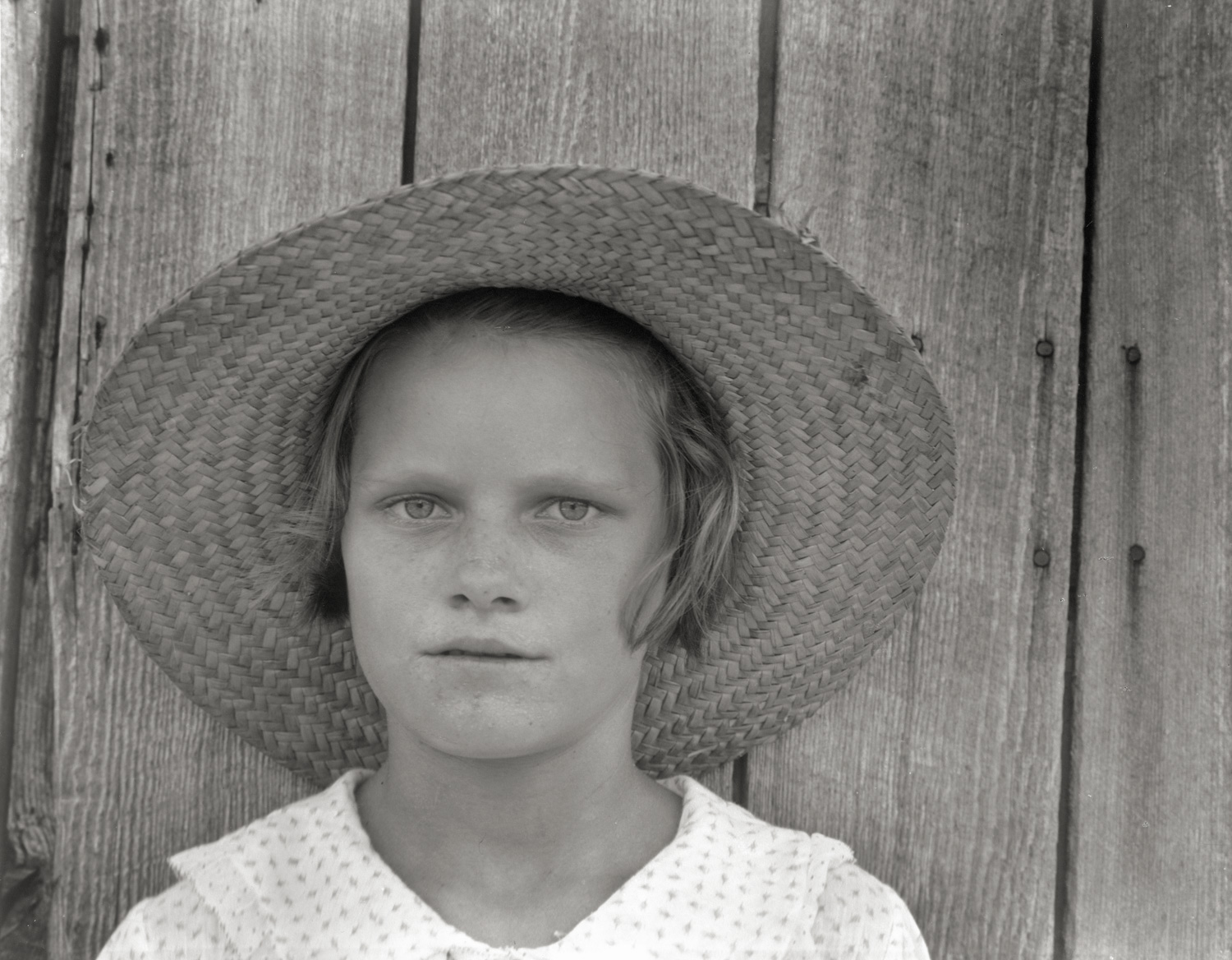 Untitled (Tenant farmer's daughter, Hale County, Alabama). 1936. Large-format, matte gelatin silver print, printed 1970s by the Library of Congress from the original negative. 28 x 35 cm. "Reproduced from the collection of the Library of Congress" stamp and number notations in pencil on the verso. Taped to linen window front mat.