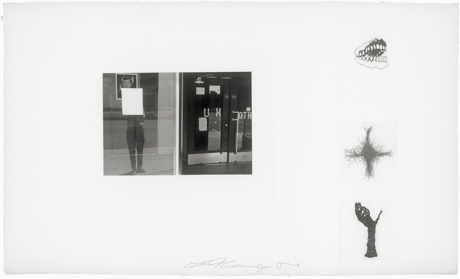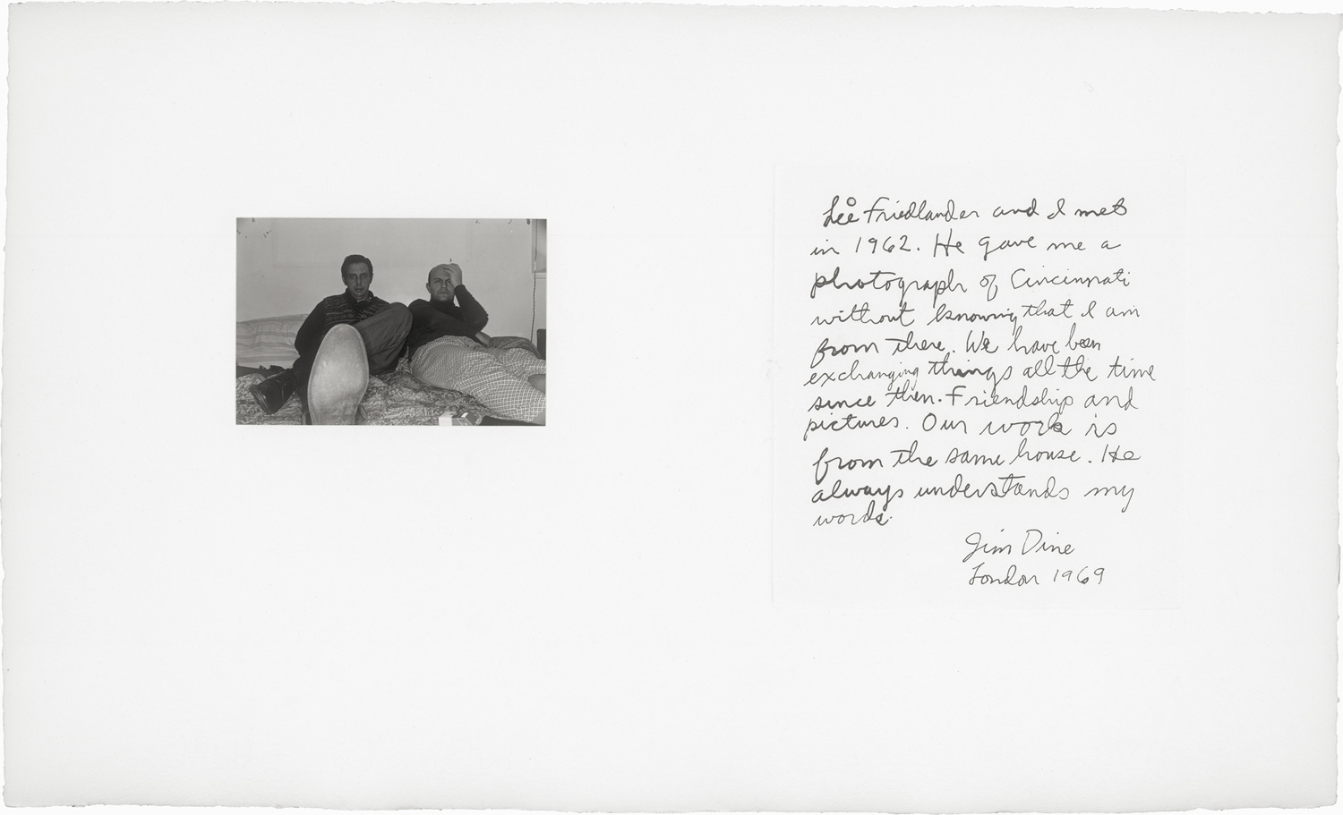 Photographs and Etchings. 1969. 17 gelatin silver prints by Lee Friedlander and 16 etchings by Jim Dine. Each between 12 x 18 and 18 x 26 cm or reverse (46 x 76 cm). Housed in original black faux-leather clamshell box with embossed title (entire size 49 x 80 x 3 cm). Published by Petersburg Press, London, in an edition of 75 plus 15 artist’s proofs.