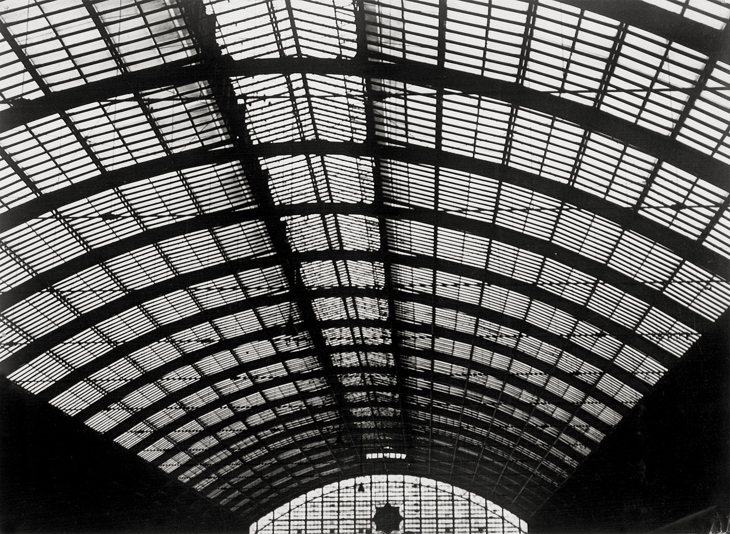 Berlin train station. Circa 1927. Vintage ferrotyped gelatin silver print. 17,5 x 23,5 cm. Photographers's copyright stamps (Berlin and Brussels) as well as numbered and annotated in pencil and red ink on the verso, hinge-mounted in upper edge in mat.