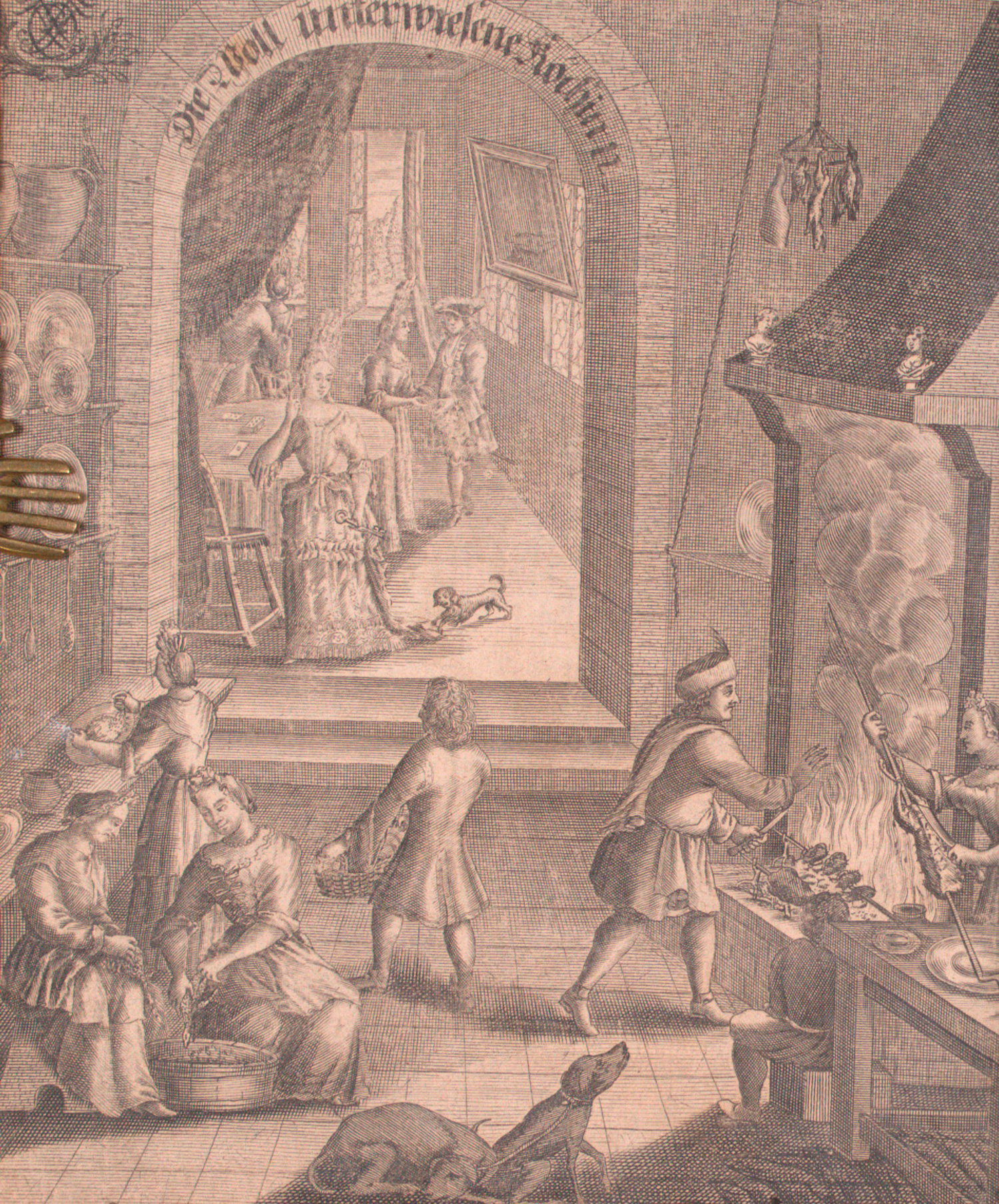 Schellhammer, Maria Sophia. Die wol unterwiesene Köchinn. Teil I-II in 1 Band. 15 Bl., 599 S.; 4 Bl., 224 S., 4 Bl. Mit 2 gestochenen Frontispizen und 22 Kupfertafeln. Titel in Schwarz und Rot. 20 x 16 cm. Pergament d. Z. (leicht berieben und fleckig) mit hs. RTitel und spanischen Kanten. Braunschweig, Christoph Friedrich Fickels, 1704-1706.