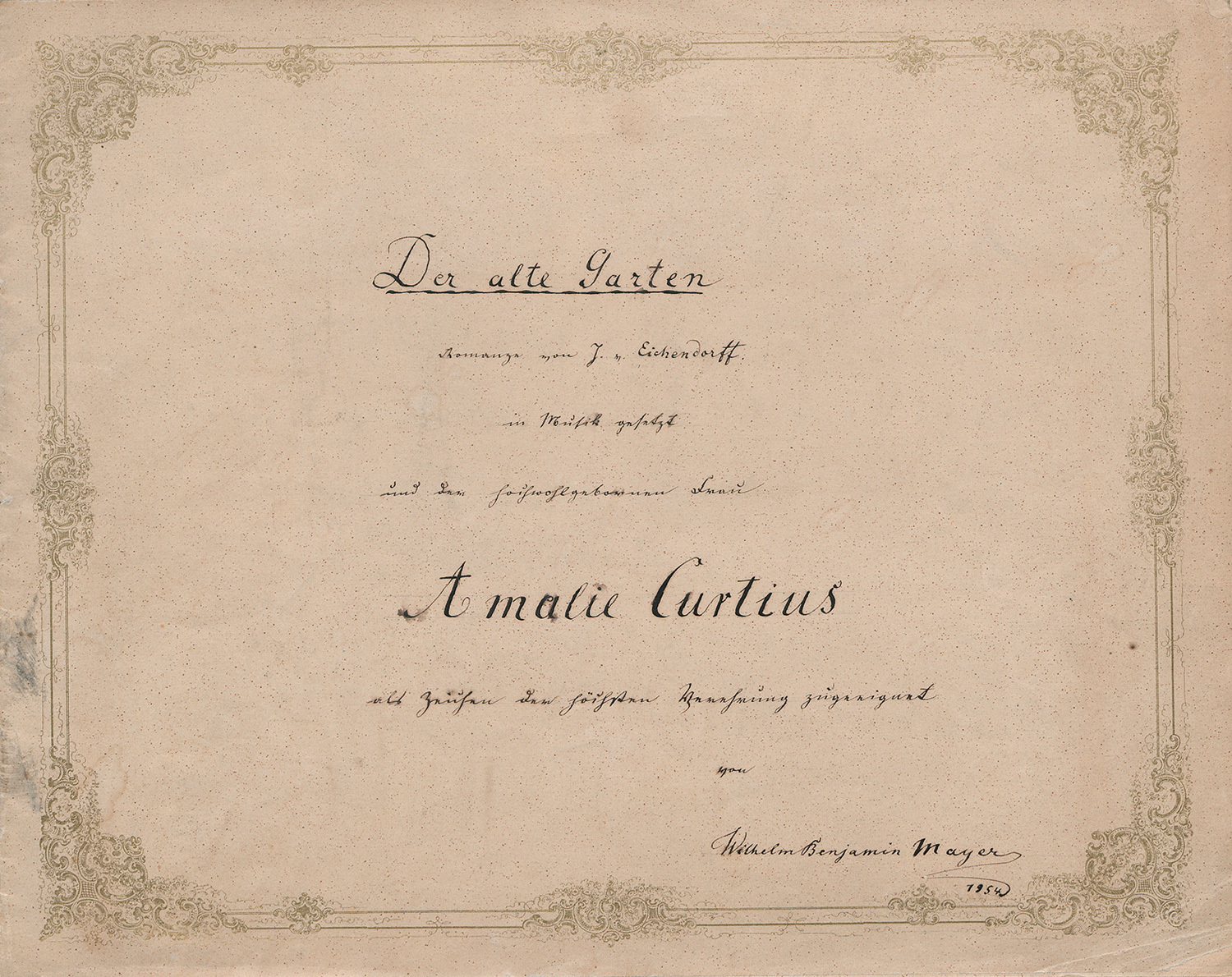 Mayer, Wilhelm Benjamin. "Der alte Garten. Romanze von J. v. Eichendorff in Musik gesetzt und der hochwohlgeborenen Frau Amalie Curtius als Zeichen der höchsten Verehrung zugeeignet". Deutsche Notenhandschrift in Sepia auf lithographischem Vordruck. 23 x 29 cm. O. O., August 1854.