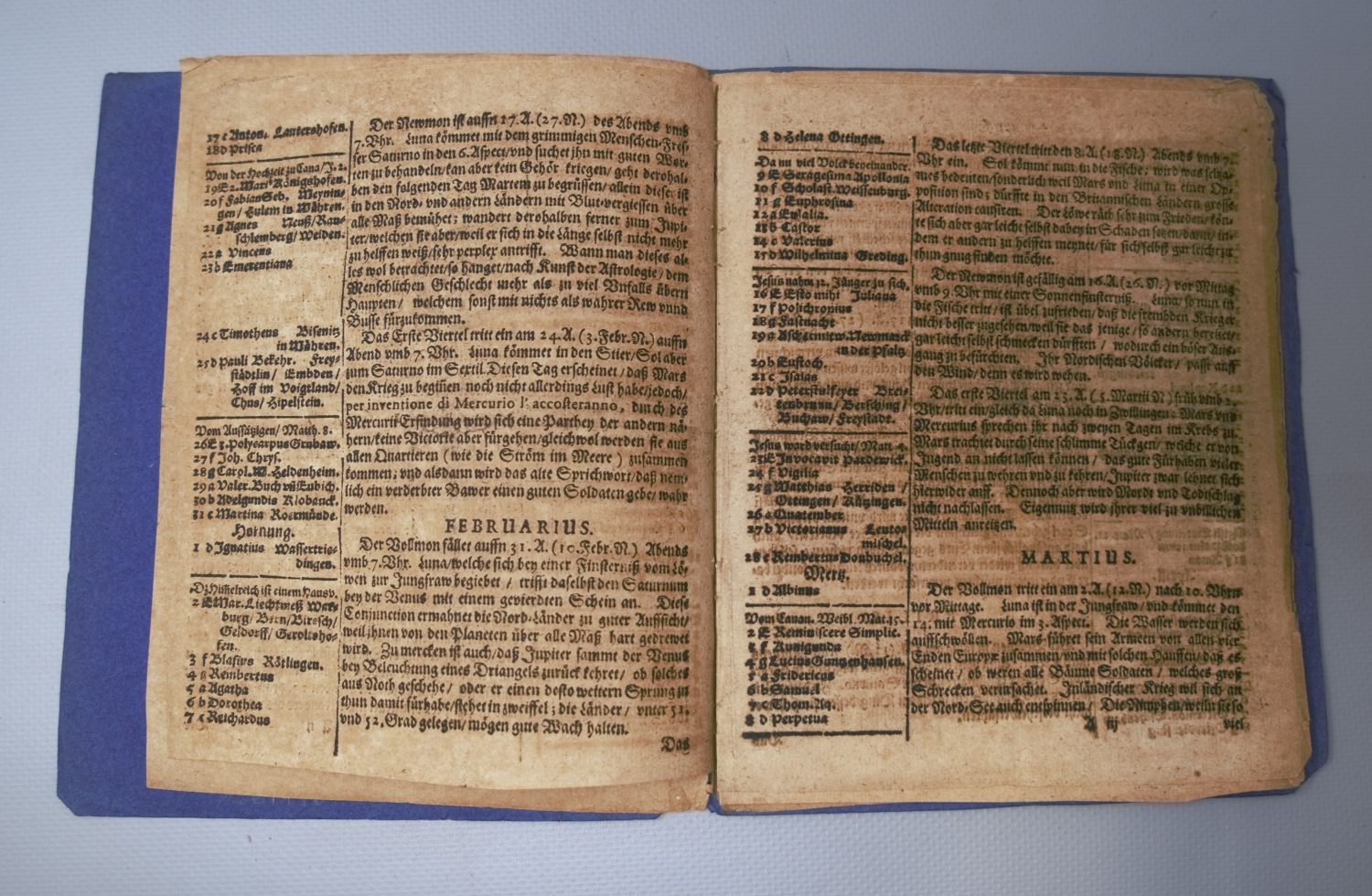 VD17 23:644965B. – Seltenes prognostisches Werk von Giovanni Antonio Magini (1555-1617), ein italienischer Astronom und Mathematiker. Wohl im Jahre 1632 zum ersten mal auf Deutsch erschienen. – Unbeschnitten und teils unaufgeschnitten. Lose im Umschlag liegende Lagen, papierbedingt gebräunt und mit Randläsuren. Mit hs. Besitzschildchen auf dem Umschlag "Prof. Dr. Gerhard Eis. Am 12. Sept. 1974 gekauft von Herrn Hans Koch, Inhaber der Firma Jacques Rosenthal Eching".