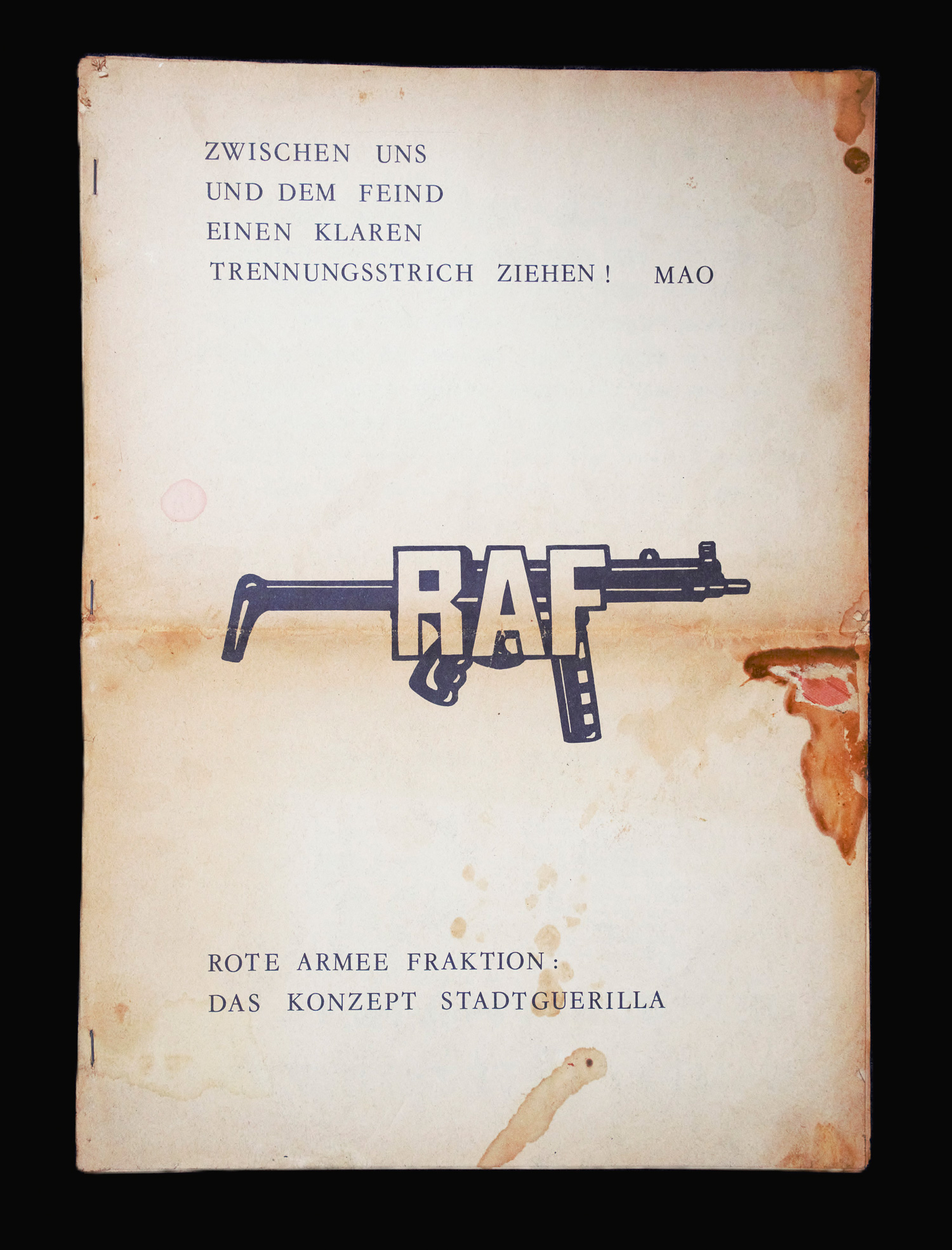 Die in der Gründungsphase der RAF wichtigste, von Ulrike Meinhof (nach Vorgaben von A. Baader und G. Ensslin) im Untergrund verfasste Schrift rechtfertigt den bewaffneten Kampf der "Stadtguerilla" aus der Illegalität heraus. Meinhof betont, dass nur die Anwendung von Gewalt ein erfolgversprechendes Mittel zur Umgestaltung der Gesellschaft sein kann. Der "US-Imperialismus" müsse in allen Gegenden der Welt bewaffnet bekämpft werden. In diesem ersten längeren programmatischen Statement taucht zum ersten Mal die Bezeichnung "Rote Armee Fraktion" auf. Das Deckblatt mit dem Symbol der RAF (Maschinenpistole mit RAF-Schriftzug) und einem Zitat von Mao Zedong. – Deckblatt stark fleckig und mit Randläsur, ebenso das nachfolgende Blatt. mittig mit Knickfalte; papierbedingt stärker gebräunt.