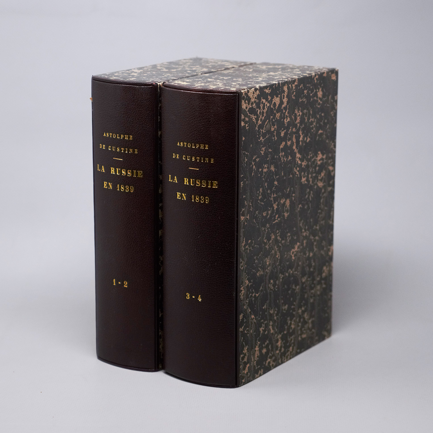Vicaire II, 1090. – Erste Ausgabe. Umfassende politische, soziale und wirtschaftliche Darstellung Russlands in 36 Briefen, die unter dem Titel "Russische Schatten (La Russie en 1839)" dann auch in deutscher Sprache erscheinen sollten. Astolphe Louis Léonor, Marquis de Custine (1790 -1857) gehörte zu den bedeutendsten französischen Reiseschriftstellern. – Gering stockfleckig, vereinzelt schwach wasserrandig, sonst schönes Exemplar in dekorativen Einbänden. - First edition of this comprehensive political, social and economic description of Russia in 36 letters (including a fold-out genealogical table). Some minor foxing, few faint damp stains. Contemporary half calf with gilt spine, boxed in modern half calf slipcase with modern half calf cover. Altogether very fine copy in decorative romantic bindings.