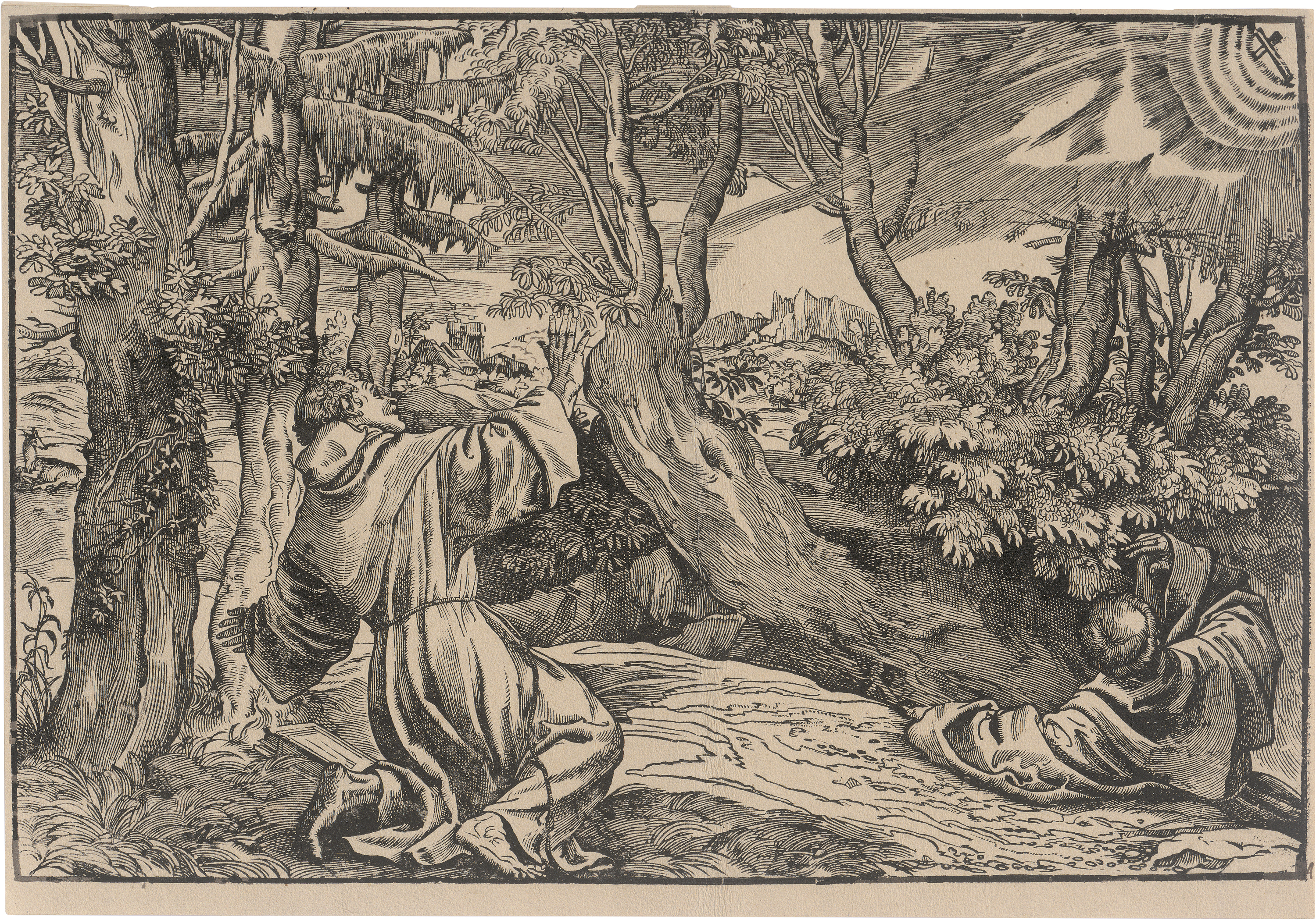 Der hl. Franziskus empfängt die Stigmata. Holzschnitt nach Tizian. 29,5 x 44 cm. Passavant VI, 235, 59, Oberhuber 173, Dreyer 18, Muraro-Rosand 30.