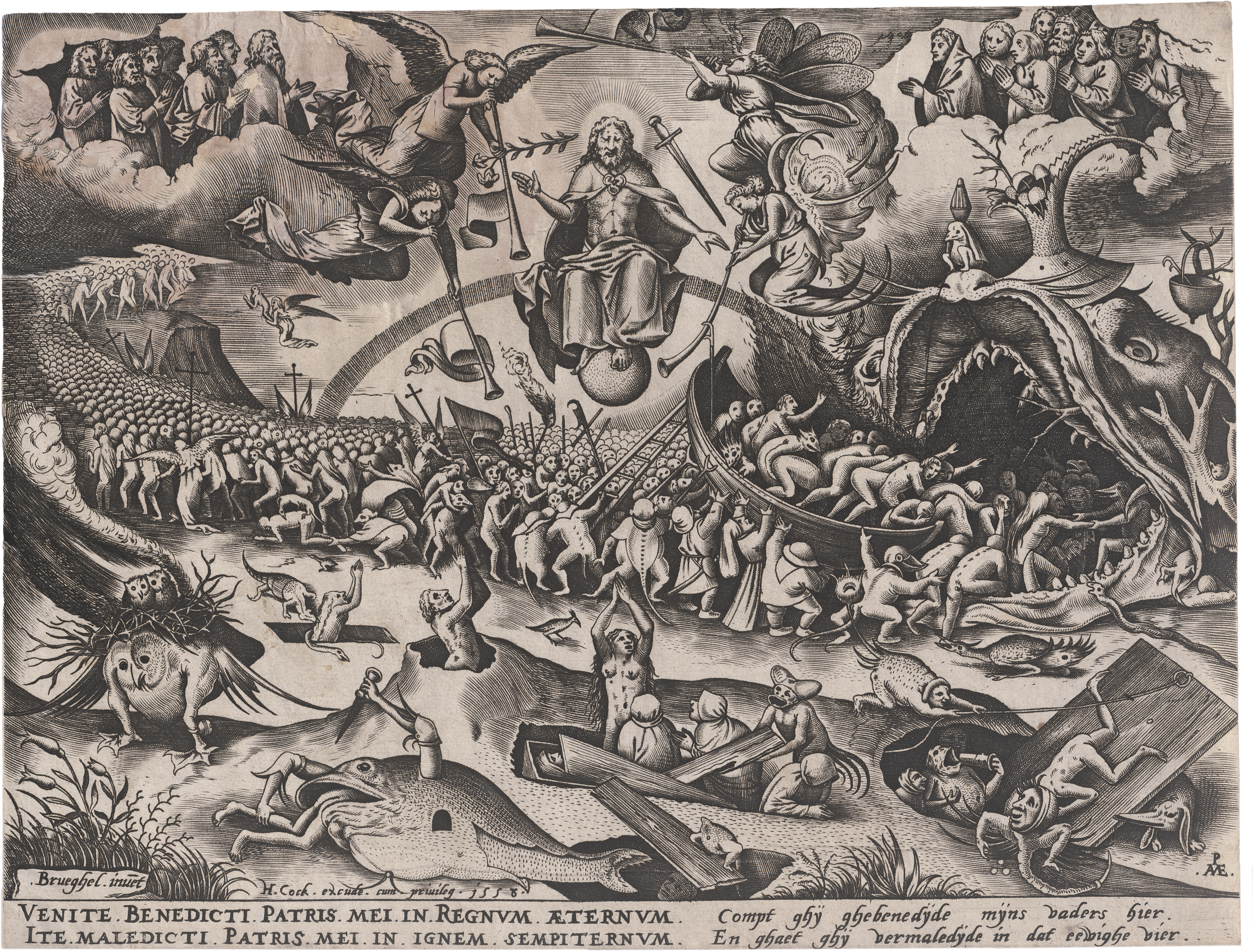 nach. Das jüngste Gericht. Kupferstich von Pieter van der Heyden. 22,4 x 29,5 cm. 1558. Hollstein (Bruegel) 121, Hollstein (Cock) 232, Bastelaer 121, Orenstein (New Hollstein) 8 I (von II), Bassens/Grieken 12 a I (von II). Wz. Blume über Buchstaben PP.
