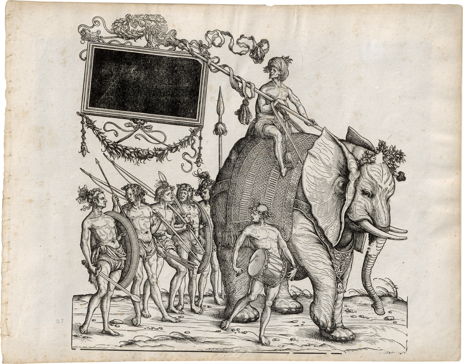 Der Triumphzug ist eine monumentale, vollständig etwa 54 Meter lange Holzschnittfolge, die von Albrecht Altdorfer gestaltet wurde und die sowohl die Feierlichkeit als auch die Festlichkeit der Teilnehmer an den Triumphen festhielt. Allen voran Hans Burgkmair, aber auch Albrecht Altdorfer selbst, sowie Hans Spinginklee, Leonhard Beck, Hans Schäufelin, Wolf Huber und Albrecht Dürer trugen Holzschnitte zu dem umfangreichen Projekt bei. Ursprünglich waren 210 Illustrationen vorgesehen, von denen bis zu Maximilians Tod im Jahr 1519 bereits 137 fertiggestellt waren. Vorhanden sind hier die Tafeln: 75, 84, 88-94, 96-98, 100-103, 105-107, 111-114, 116-117, 119-124, 126-129, 132. Sämtlich ausgezeichnete bis prachtvolle, teils kräftige Drucke der seltenen 2. Ausgabe, die von den in Ambras und Graz aufgefundenen Holzstöcken genommen wurde, meist auf dem wohl vollen Bogen. Die Banderolen und Schilder, wie auch bei der 1. Ausgabe von 1526, noch mit dem schwarzen Grund. Teils leicht stockfleckig, links alte Heftspuren, dort vereinzelt mit hinterlegten Randschäden, leichte Knick- und Gebrauchsspuren, verso vereinzelt vertikale Trockenfältchen, ein Blatt mit Fehlstelle links (außerhalb der Darstellung), weitere kleine Erhaltungsmängel, insgesamt in sehr schöner und einheitlicher Erhaltung.