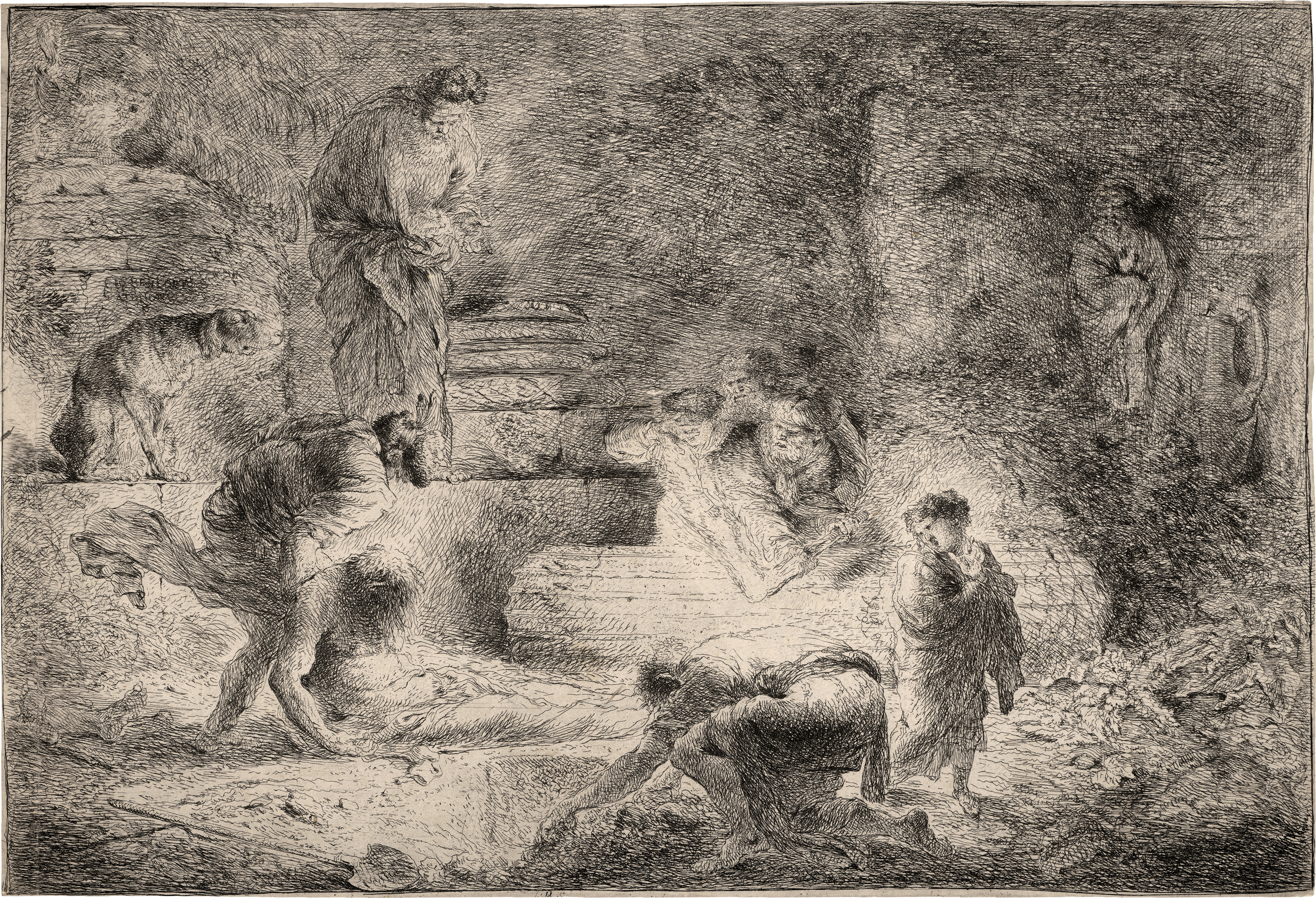 Tobit, wie er Tote begräbt. Radierung. 20,1 x 29,6 cm. B. 5, Bellini 58, TIB (Commentary) .005. Wz. Bekröntes Lilienwappen.