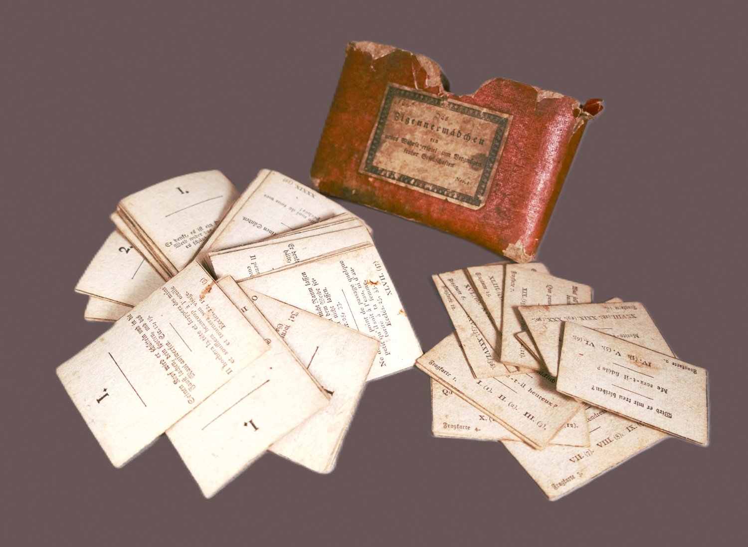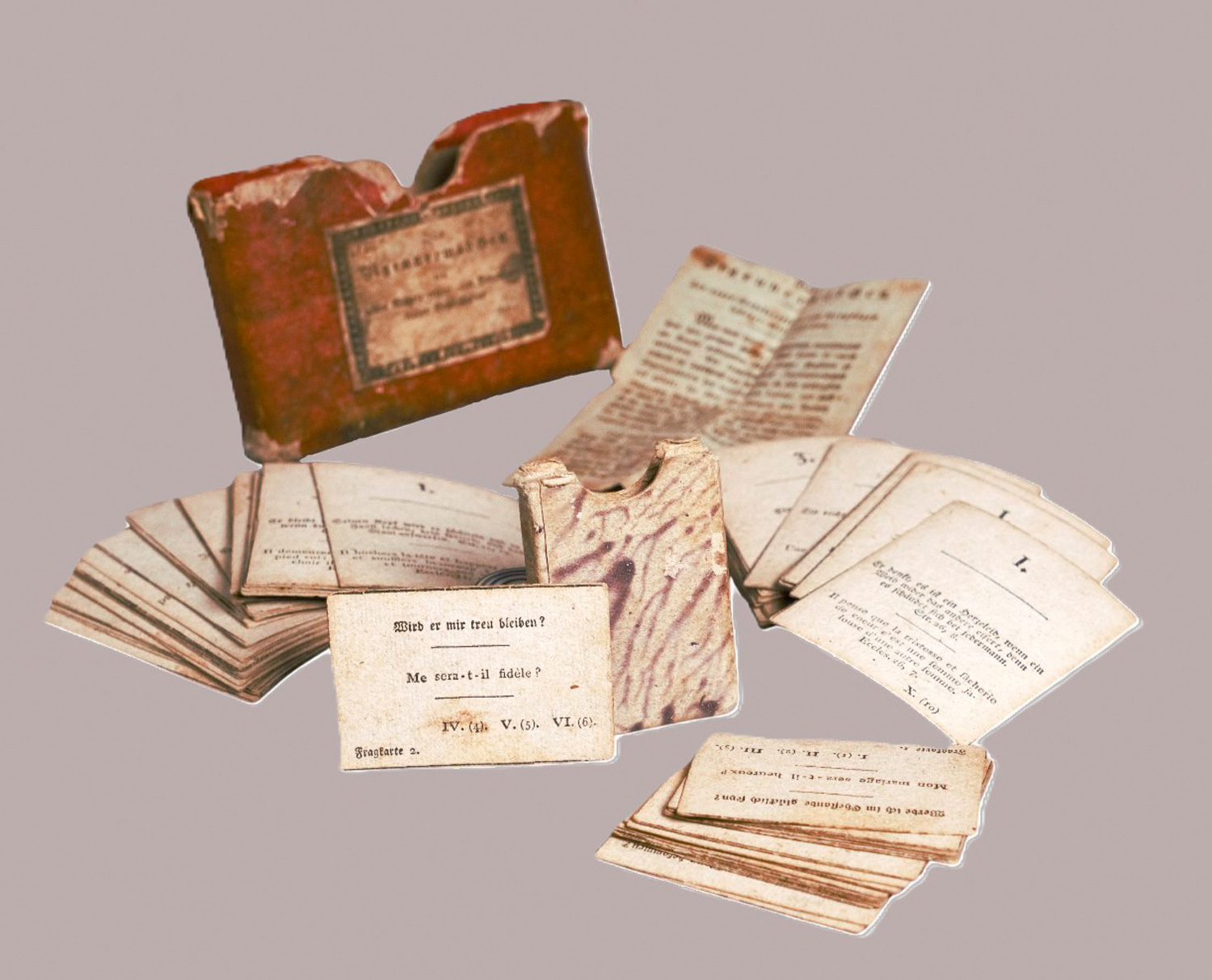 "Man wird dieses unterhaltende Gesellschaftsspiel sehr geeignet finden, frohe Laune in einem zur Freude getimmten Kreise junger Personen zu verbreiten. Ein wahrsagendes Zigeunermädchen ertheilt da Aufschluß der Fragen, in den wichtigsten Angelegenheiten des menschlichen Lebens, und auch auf andere, die blos von Neugier oder Vorwitz eingegeben scheinen, z. B. Ob man sich verheirathen, ob man in dem Ehestande glücklich seyn werd; ob die Geliebte, der Mann, die Frau, uns treu verbleiben wird, ob sie unsere Liebe verdient u. s. w. Die Antworten fallen, wie sich denken läßt, sehr ungleich aus, und geben reichlichen Stoff zum Lachen. Das Spiel wird auf folgende Weise gespielt: [...]" – Anleitungsblatt stockfleckig, zweimal gefaltet und abgegriffen. Die Karten papierbedingt leicht gebräunt, teils gering stockfleckig und mit altersgemäßen Gebrauchsspuren. Offenbar bespielt, insgesamt jedoch in guter Erhaltung.