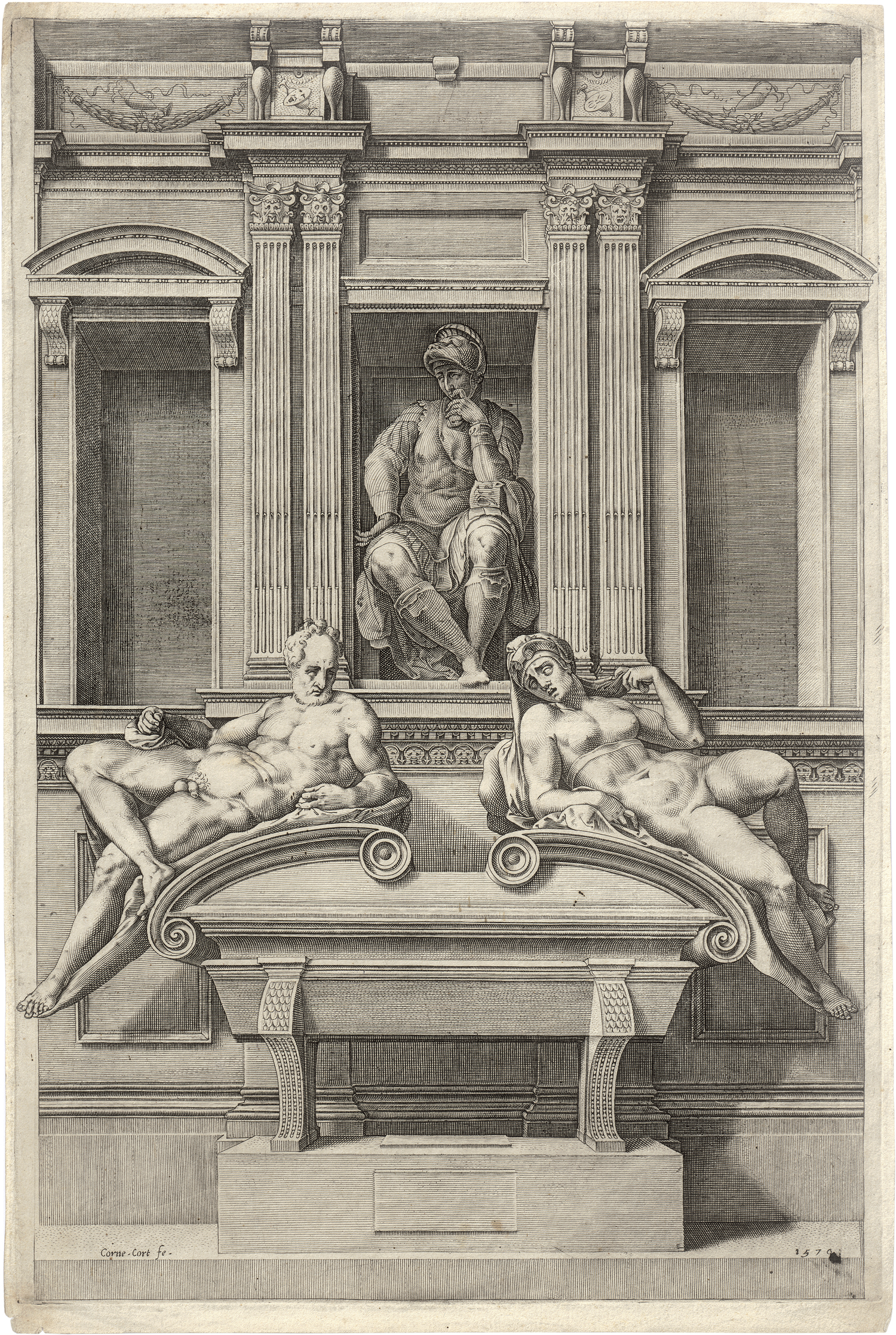 Grabmal des Lorenzo de' Medici; Grabmal des Giuliano de' Medici. 2 Kupferstiche nach Michelangelo. Je ca. 41,9 x 27,4 cm. 1570. Bierens de Haan 199, 200, Hollstein 199, 200, Sellink (New Hollstein) 217, 218, je I (von II), A. Alberti (La fortuna di Michelangelo nelle stampe del cinquecento, Mailand 2015) 334, 335, je I (von II). Wz. Schild mit Buchstabe F über Dreiberg (vgl. Woodward 332 and 333, ca, 1580-1600).