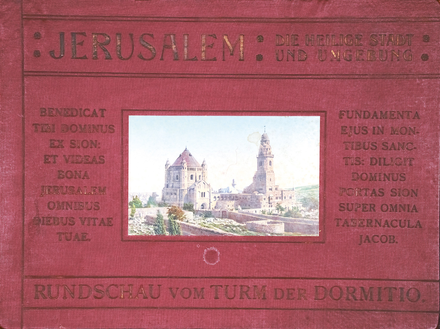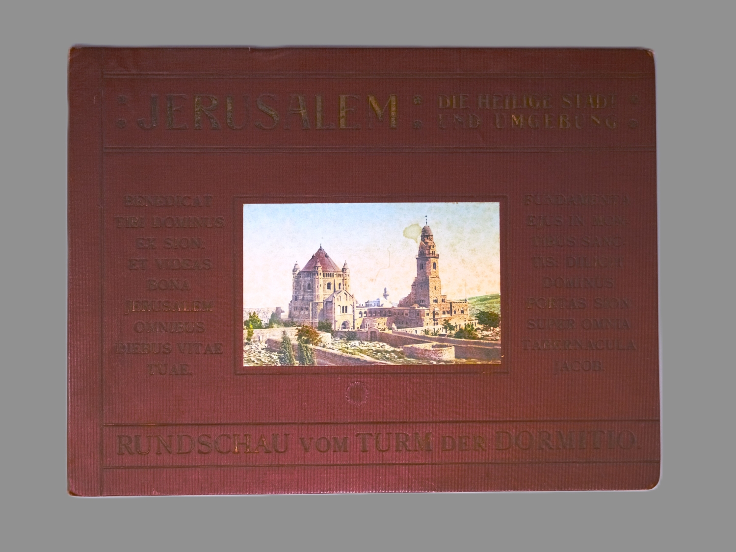 Einzige Ausgabe des prächtigen 360°-Faltpanoramas von Jerusalem im Format 21,5 x 229 cm mit untenstehender detaillierter Legende. Erschienen als "Fest- und Erinnerungsgabe der Benediktiner vom Berge Sion zur Vollendung und Einweihung der Kirche Mariae-Heimgang am 10. April des Jahres 1910" (Innendeckel). – Papierbedingt schwach gebräunt, sonst wohlerhalten. Mit Geschenkeintrag von 1914.