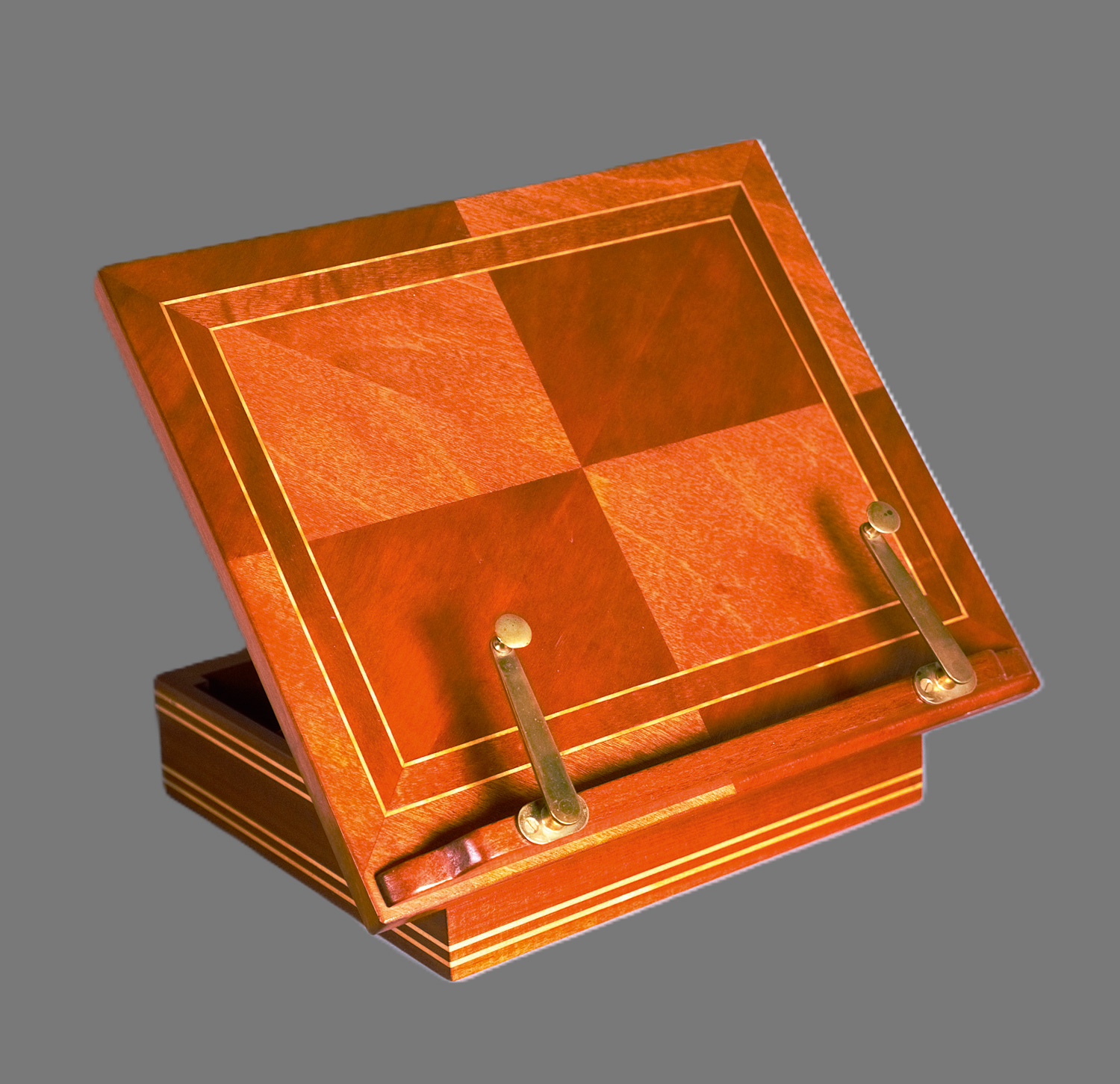 Lesepult. Klappbares Schreibtischpult aus Nussbaumholz, rückseitig mit arretierbarer Stützleiste zur stufenweisen Neigungsverstellung, vorne mit zwei ausschwenkbaren Buchstützen aus Messing. Die Pultfläche mit zwei intarsierten rechteckigen Doppelrahmen, in hellem und dunklerem Holz. Ca. 28 x 37 x 28 cm. Wohl Deutschland Ende 20. Jahrhundert.