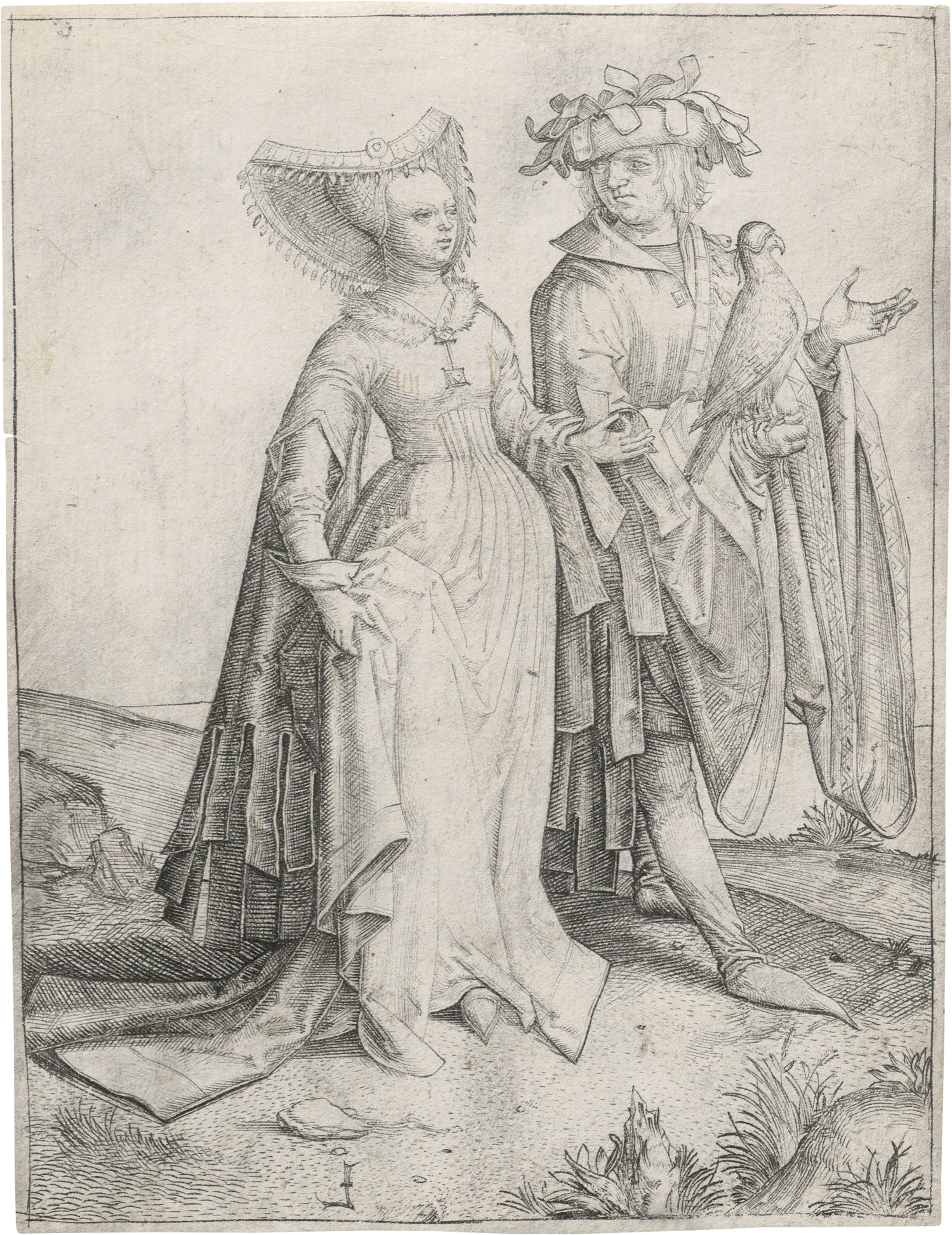 Der Kavalier mit dem Falken und der Edeldame. Kupferstich. 11,6 x 8,7 cm. B. 145, Hollstein 145, Filedt Kok (New Hollstein) 145. Wz. Vierblatt (Fragment, obere Spitze eines Wappens mit drei Lilien und angehängtem Buchstaben c, vgl. New Hollstein, Watermarks, S. 297, Nr. 1a).