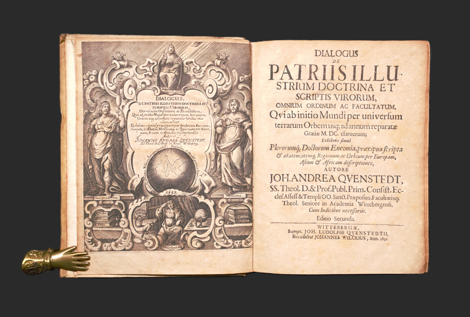 VD17 1:007903K. Besterman 57. Erman-Horn I, 1. – Seltene erste Ausgabe der ersten Bibliographie von Akademieschriften als alphabetisch nach Schlagworten geordneter Führer durch die einschlägige Literatur. Erfaßt werden sowohl selbständig als auch unselbständig erschienene Schriften. Mit einer Vorrede von Samuel Stryk. – Etwas gebräunt. – Vorgebunden: Johann Andreas Quenstedt. Dialogus de patriis illustrium doctrina et scriptis virorum, omnium ordinum ac facultatum, qui ab initio mundi per universum terrarum orbem usque ad annum ... M.DC. claruerunt. Editio secunda. 7 Bl., 688 S., 20 Bl. Mit gestochenem Frontispiz. Wittenberg, J. Wilcke für J. L. Quenstedt, 1691. - Zweite Ausgabe, erstmals 1654 erschienen. Geographisch geordnete Bibliographie der Gelehrtengeschichte der Welt (inkl. Asien und Afrika) bis zum Jahr 1600, durch ein alphabetisches Namens- und Ortsregister erschlossen. - VD 17 39:129579W. Besterman 809.