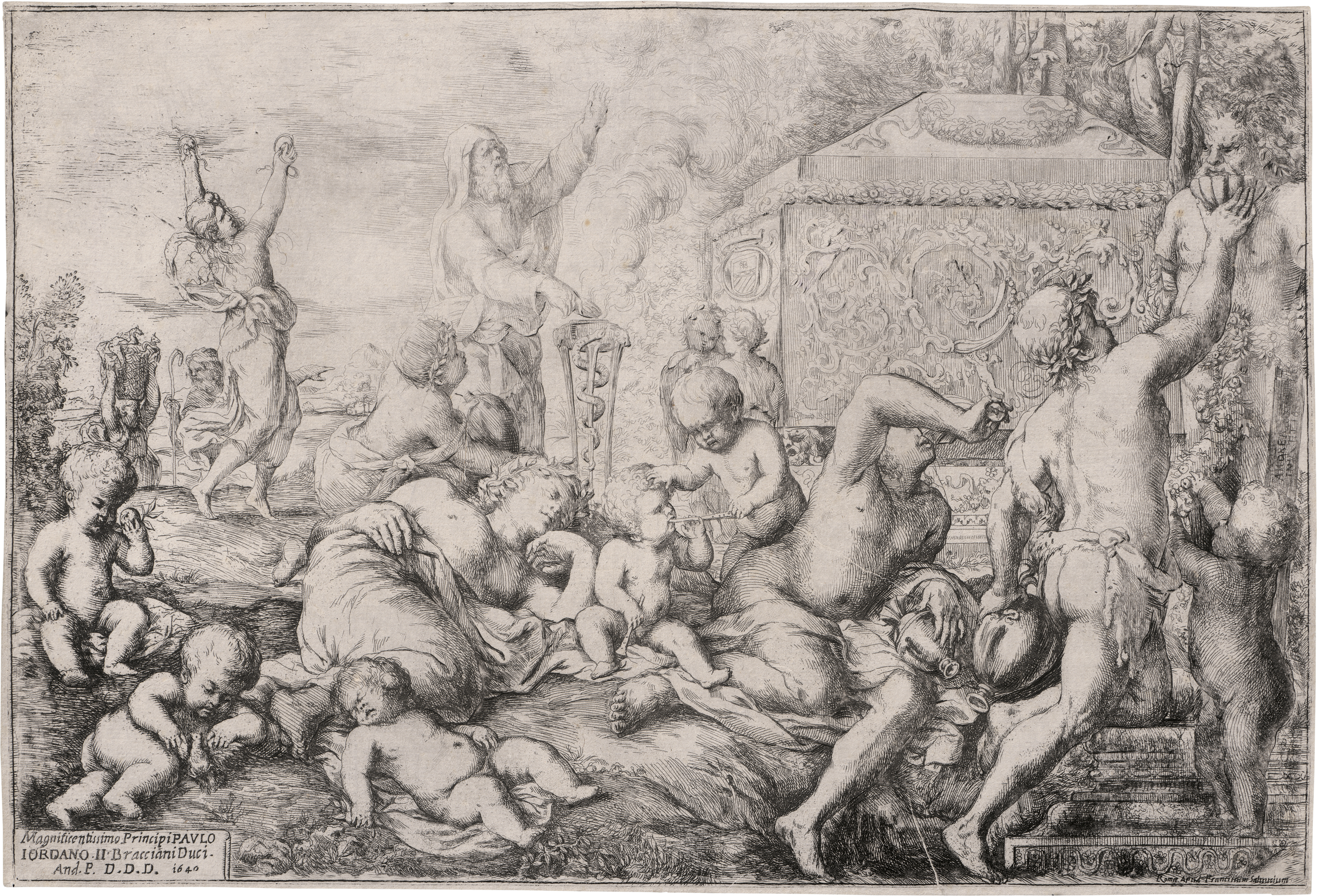 Bacchanal mit Altar, Faun und Silenus. Radierung nach Tizian. 26,4 x 39,3 cm. 1640. B. XX, S. 170, 3, TIB (Commentary) .003 S1 (von S3). Wz. Kreuz mit Initialen im Oval.