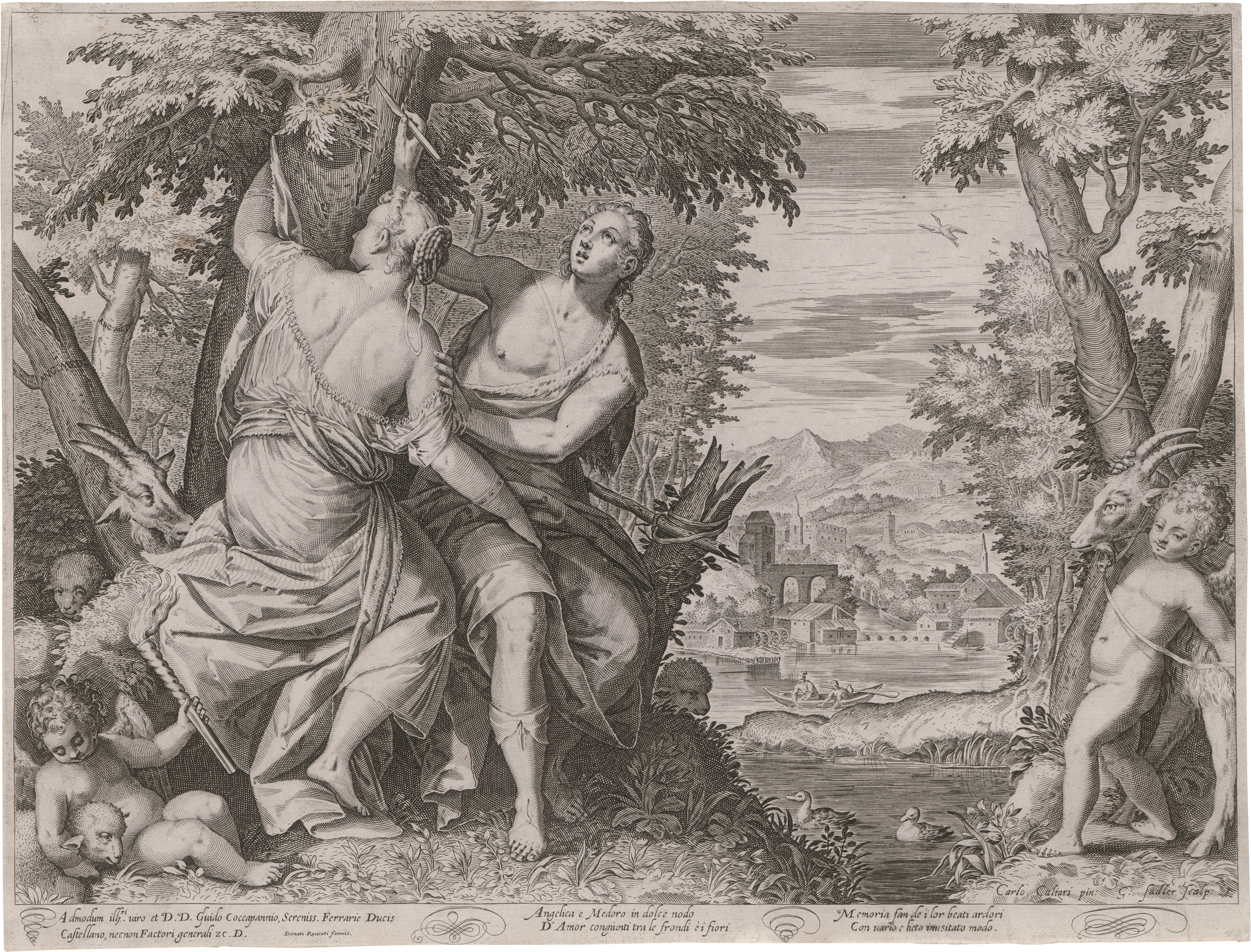 Angelika und Medoro. Kupferstich nach Carlo Calinari. 32,1 x 42,3 cm. Hollstein 103. Wz. Wappenschild mit sechszackigem Stern über M.