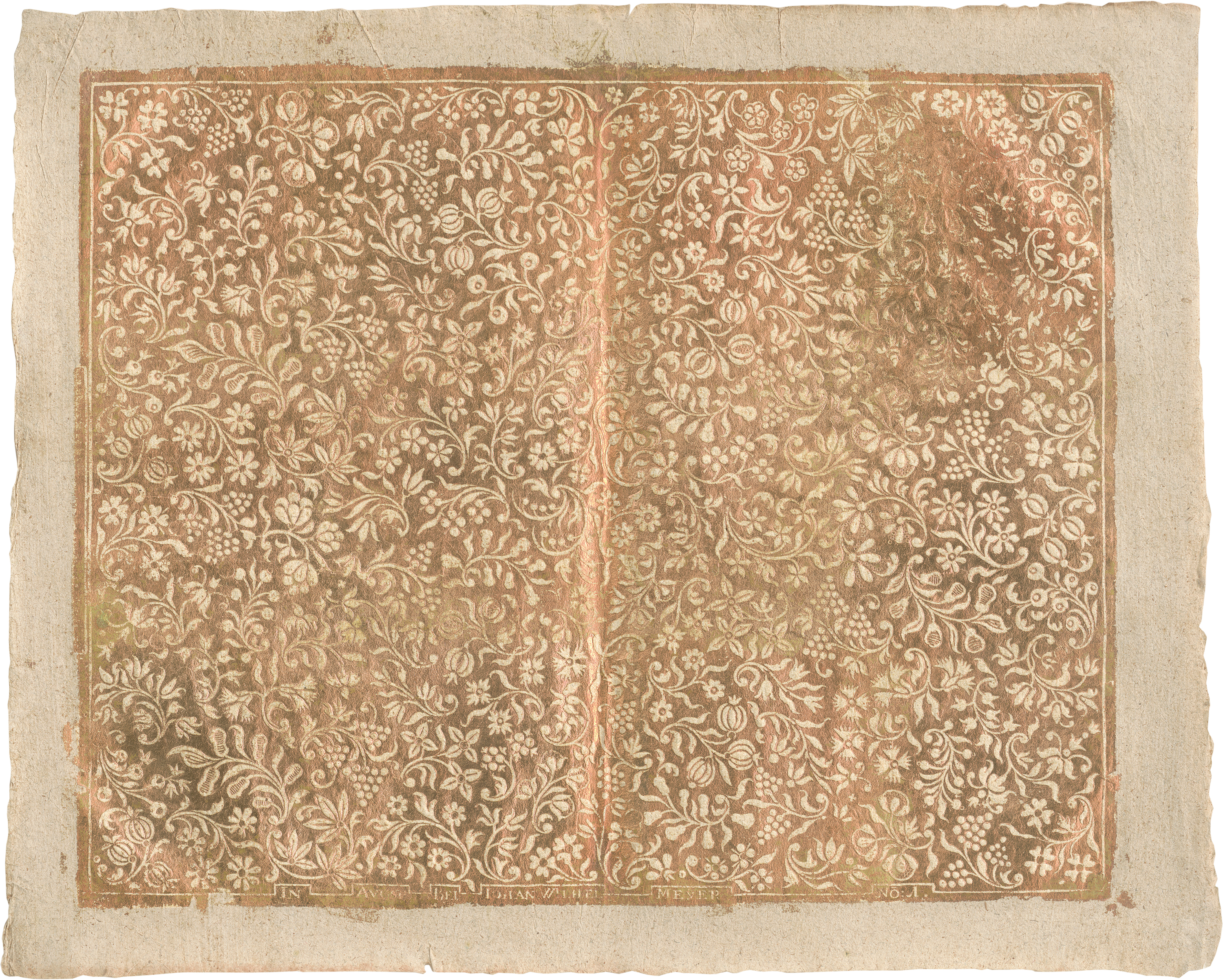 Das erste Blatt der Serie des in Augsburg um 1740 bis 1780 tätigen Buntpapierers Johann Wilhelm Meyer mit flächendeckender von Holzmodel gedruckter Bronzefirnis, in Negativtechnik sehr feines, kleinteiliges Rankenwerk mit Sternchenblüten, kleinen Nelken und Früchten wie Beeren, Hagebutten und Weintrauben. In der linken unteren wie rechten oberen Ecke ein Zweig mit jeweils drei Granatäpfeln. Der Rahmen ist durch eine einfache ausgesparte Linie gezeichnet, die um die Signatur in Versalien geführt wird. - Prachtvoller Druck mit dem Schöpfrand. Mittelfalte, im Rand etwas fleckig, kleine Randläsuren, in der Darstellung vereinzelt schwache wohl Rostfleckchen, sonst sehr schön. Aus der Sammlung Peter Aschenbrenner (laut Besitzer).