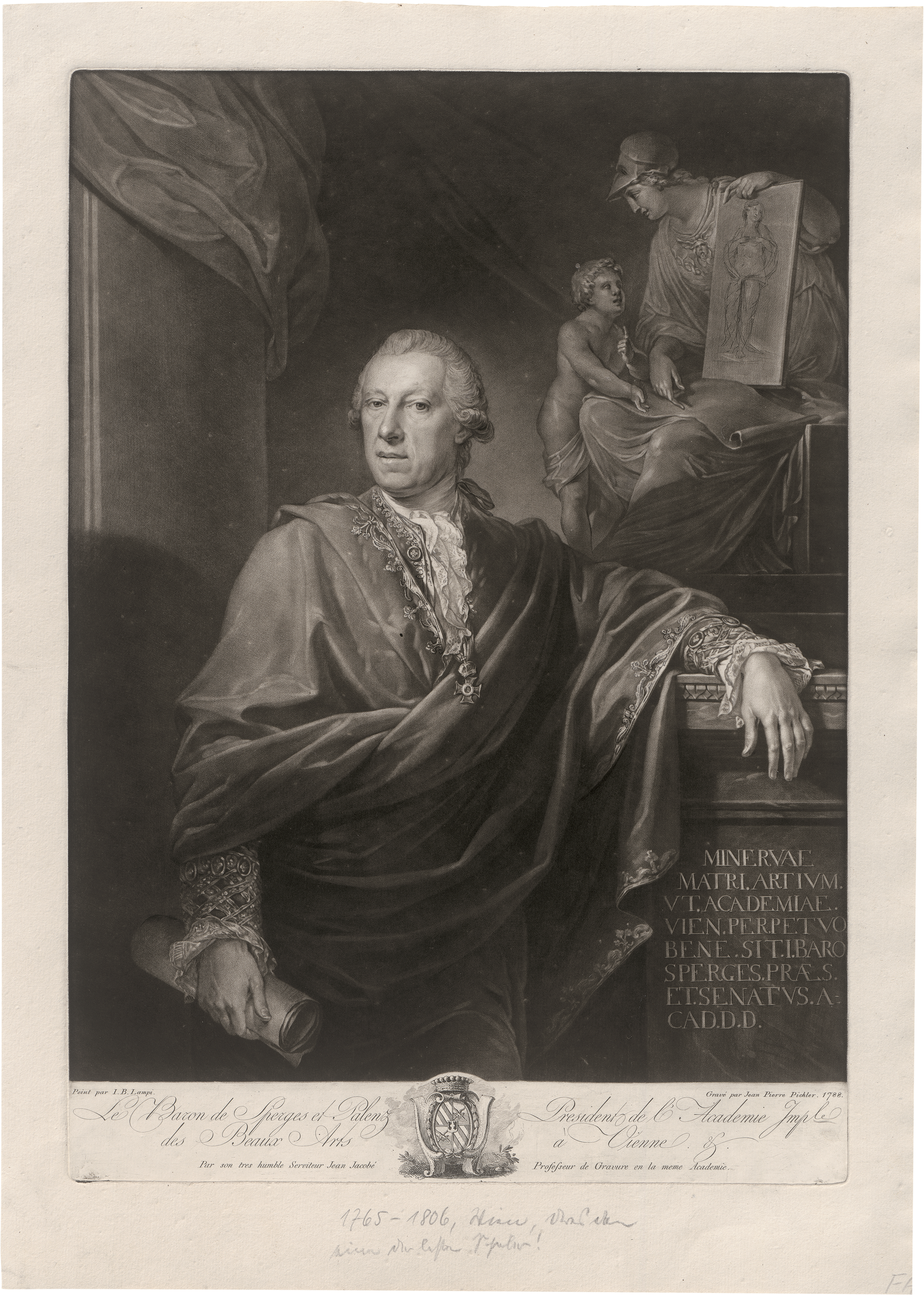 Bildnis Jospeh Freiherr von Sperges auf Palenz und Reisdorf. Schabkunstblatt auf Bütten nach Johann Baptist Lampi. 49,7 x 25,1 cm. 1788. Nagler 29, Le Blanc 90 nach I. Wz. Kreuz im Kreis mit Nebenmarke Schrift.