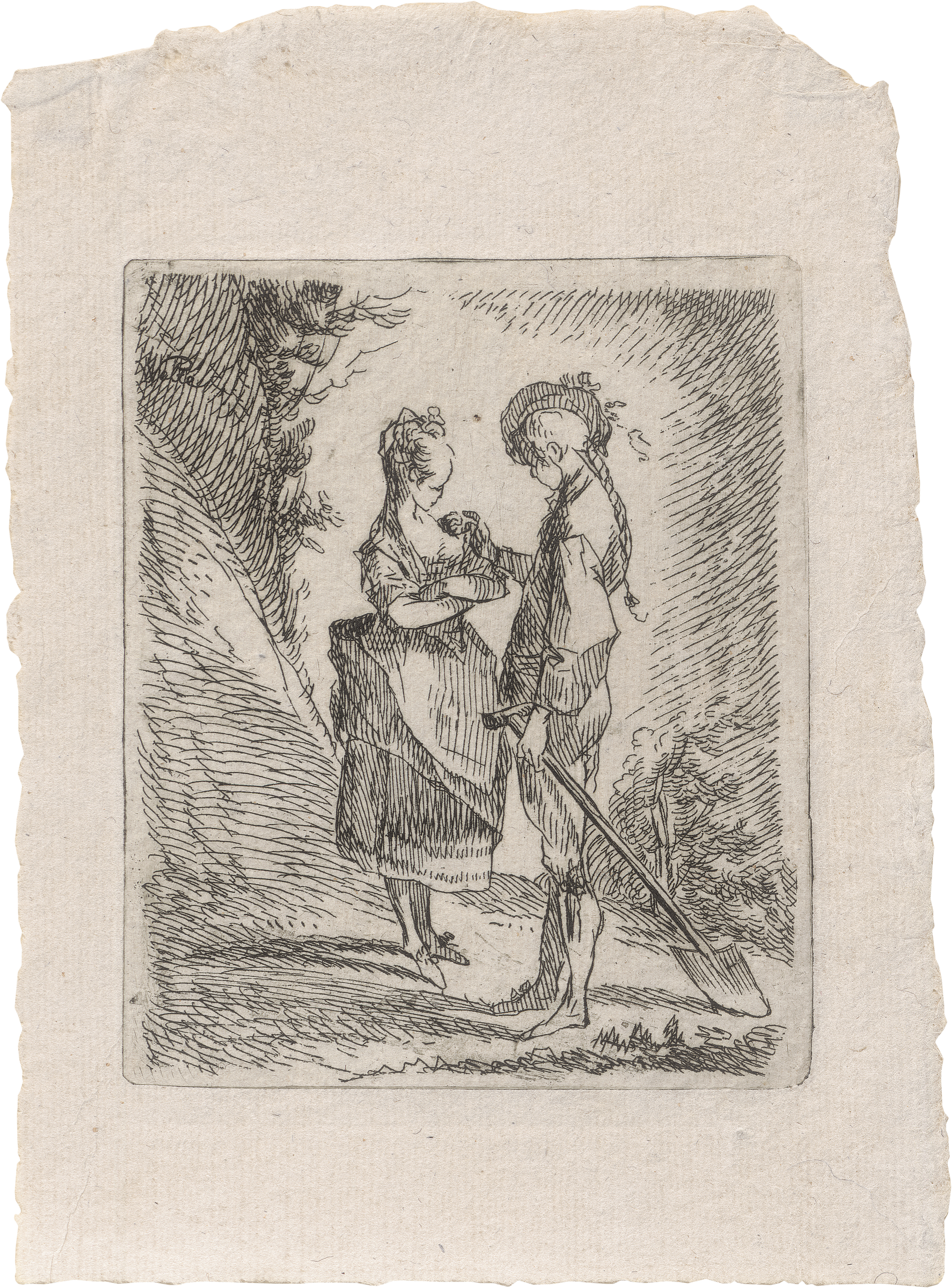 Der Gärtner mit dem Mädchen. Radierung. 9,2 x 7,8 cm. Um 1775. Gwinner: Zusätze und Berichtigungen zu Kunst und Künstler in Frankfurt am Main, 1867, S. 94f. Nr. 12, Nagler 9.