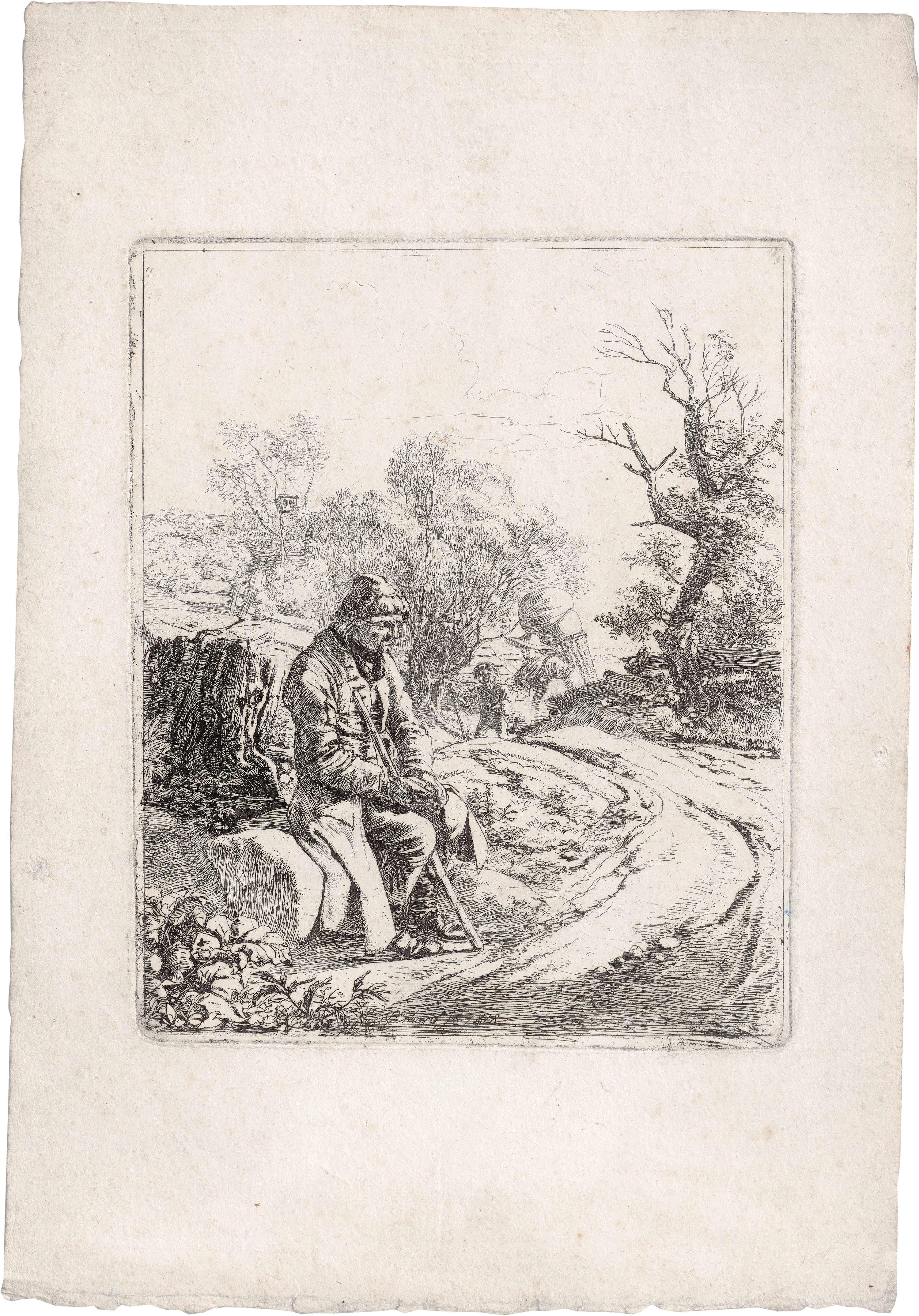 Der am Weg sitzende Greis. Radierung auf Velin. 15,6 x 12,8 cm. 1818. Apell 75 I (von II).