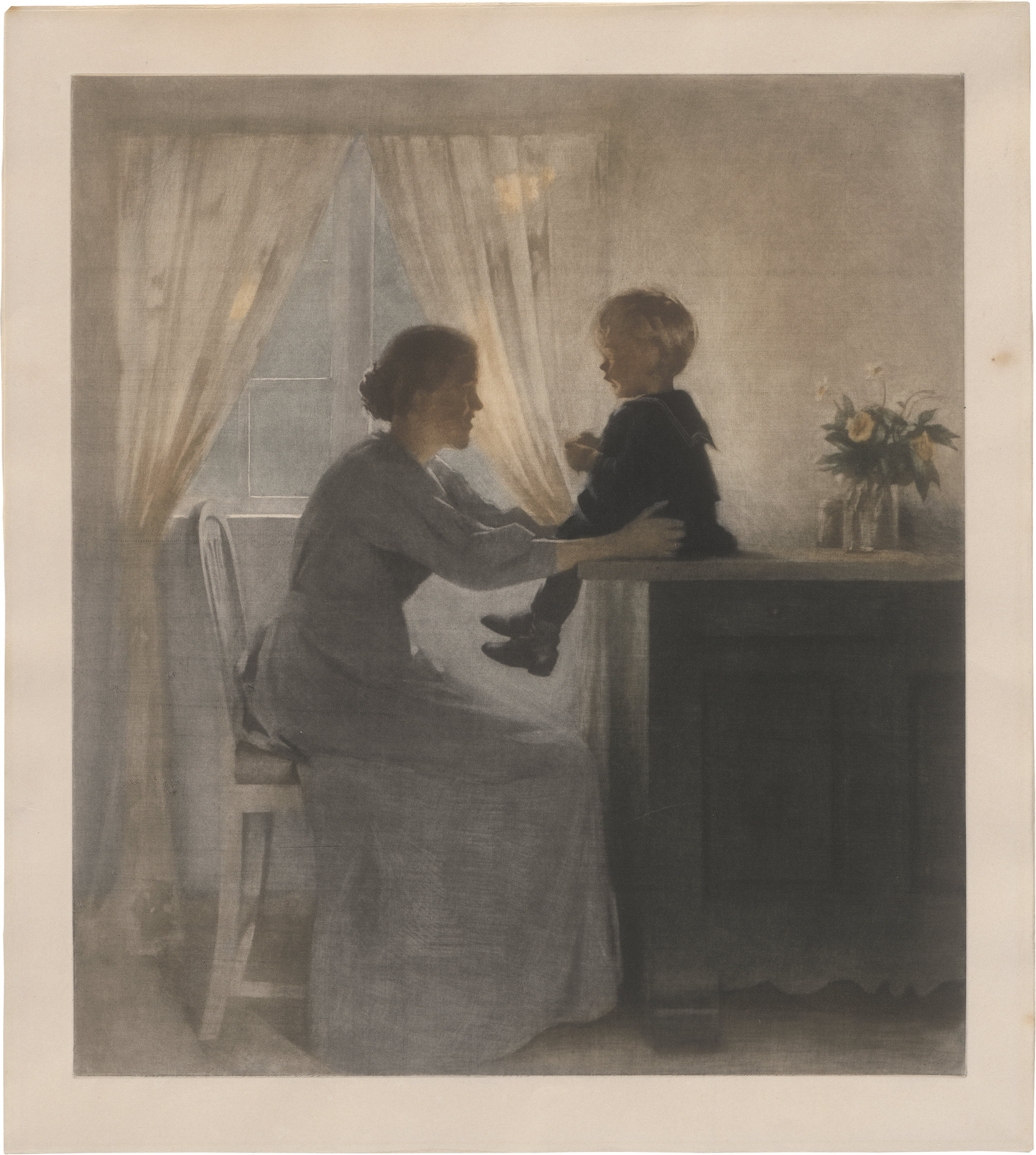 Dargestellt ist Ilsteds Frau mit Söhnchen Jens. Ganz ausgezeichneter, farblich wunderbar zart nuancierter Druck mit schmalem Rand. Geringe Alters- und Gebrauchsspuren, zwei Stockflecken im weißen Rand rechts, Reste alter Falzspuren entlang der äußersten Blattkanten, oberflächliche Kratzspur in der Kommode, sonst in sehr schöner Erhaltung.