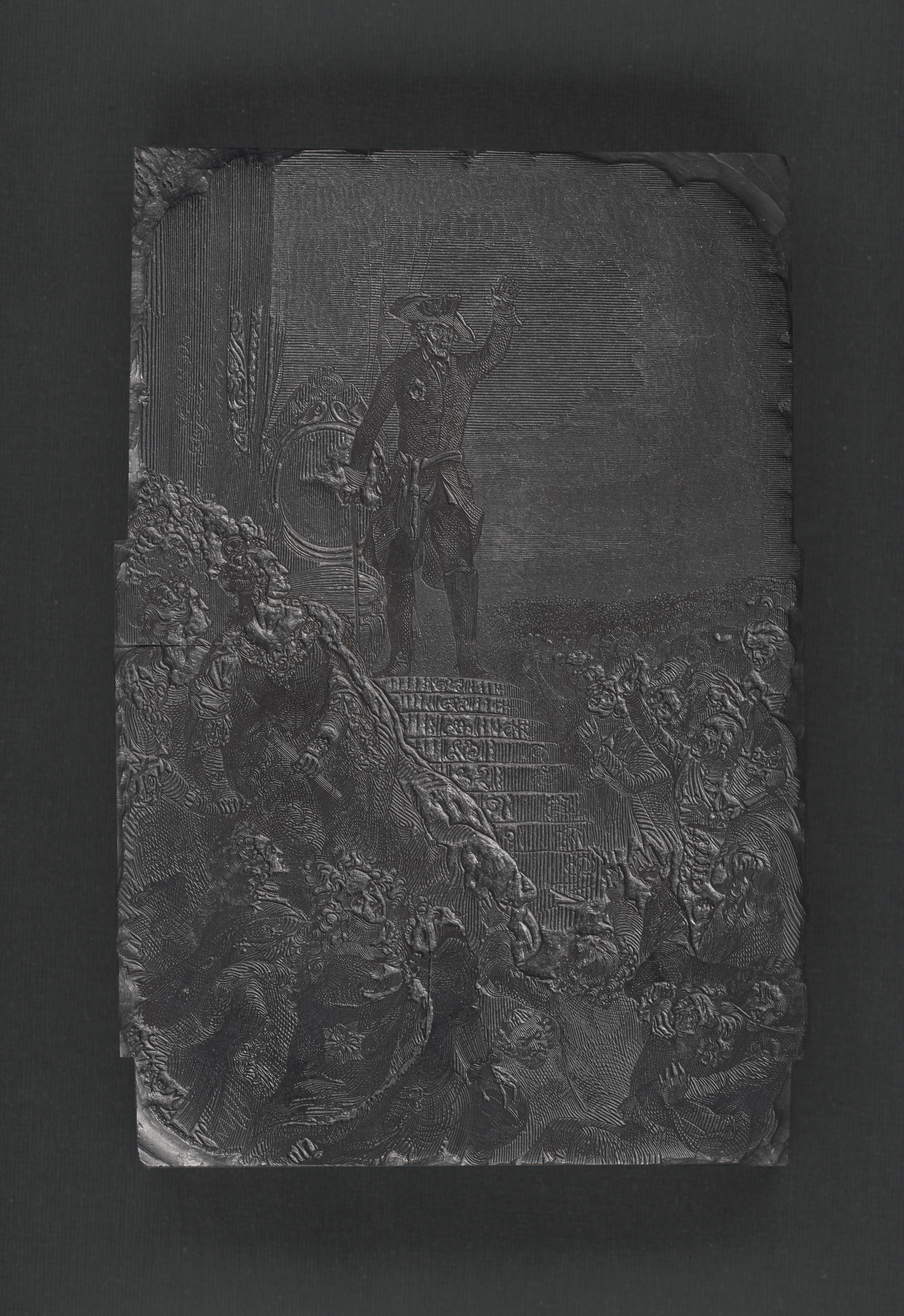 Friedrich über dem Volk und den besiegten Fürsten: I. Fassung; Eine Gruppe von Offizieren des Gardekorps vor der Potsdamer Garnisonskirche; Der König exerziert selber im strömenden Regen. 3 Druckstöcke für die Holzstichillustrationen zu Franz Kugler "Geschichte Friedrichs des Grossen", Leipzig 1840. 17,6 x 12,2 cm; 12,8 x 12,2 cm; 5,5 x 11,6 cm. Um 1839.