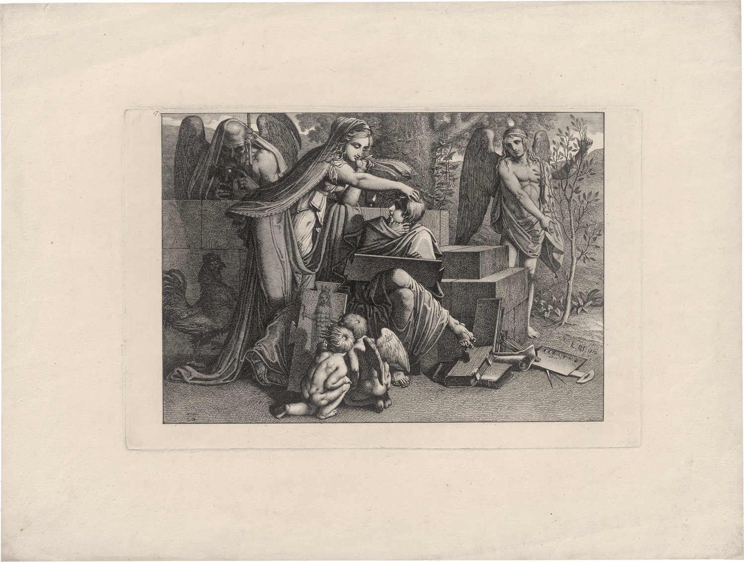 Allegorie auf die Kunst: Ein Jüngling vom Genius der Kunst inspiriert. Radierung auf Velin. 21,9 x 33,3 cm (Plattenkante); 35,9 x 48 cm (Blattgröße). 1810. Nagler 5.