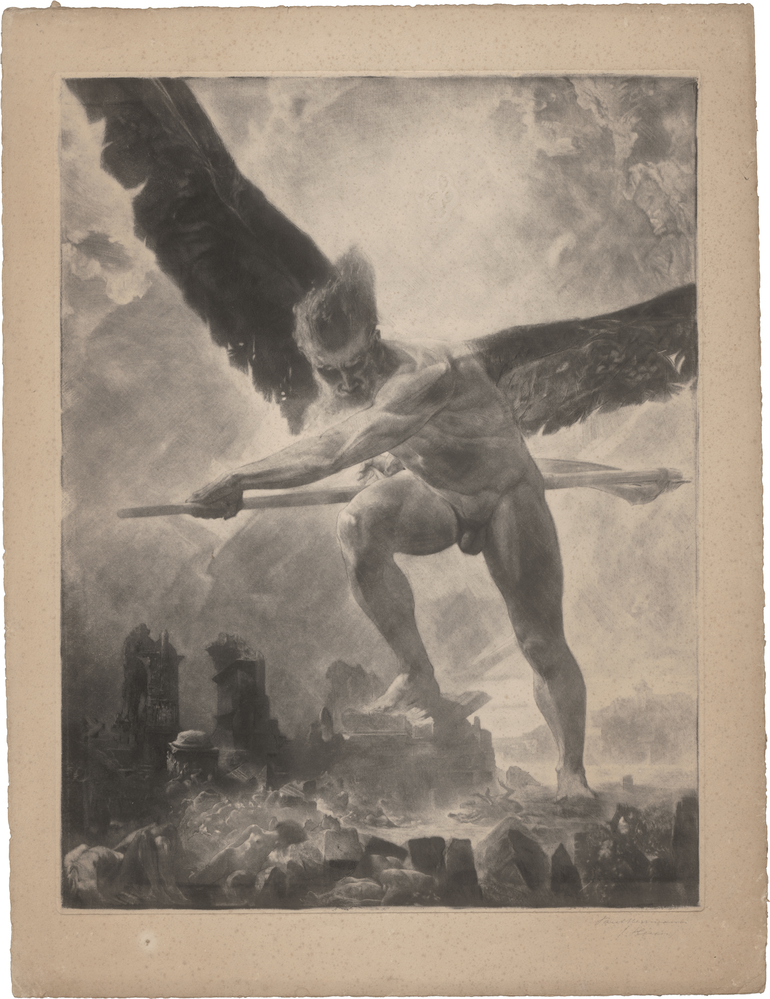 "Zeit": Chronos mit seiner Sense. Schabkunst und Roulette auf Velin. 56,6 x 44 cm (Plattenrand); 66,5 x 51 cm (Blattgröße). Signiert und bezeichnet. (1913). Singer 155 XIII.