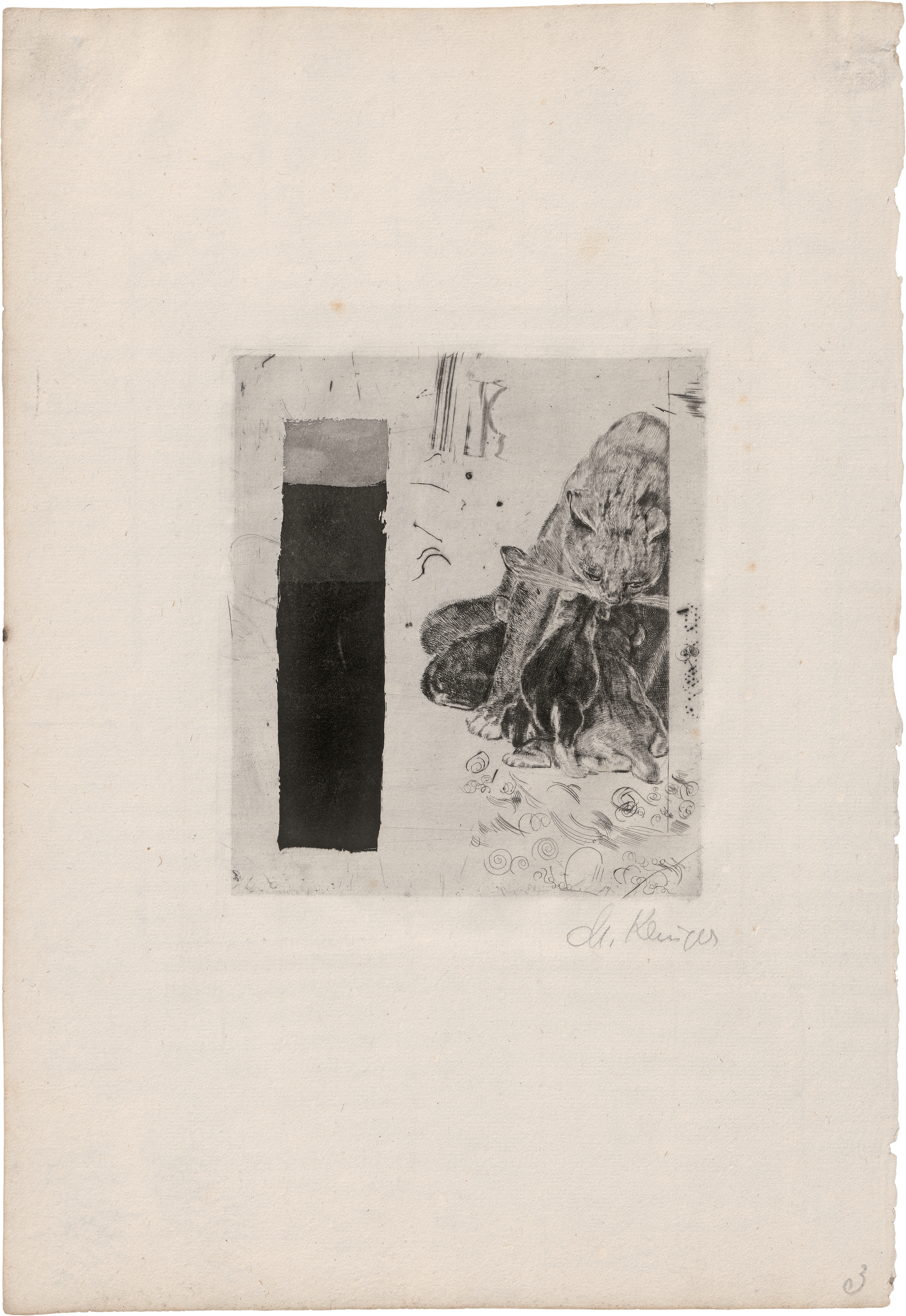 Katze und säugende Jungen. Radierung und Aquatinta auf Bütten. 14 x 12,5 cm. Unten rechts signiert "M. Klinger". Beyer 389.