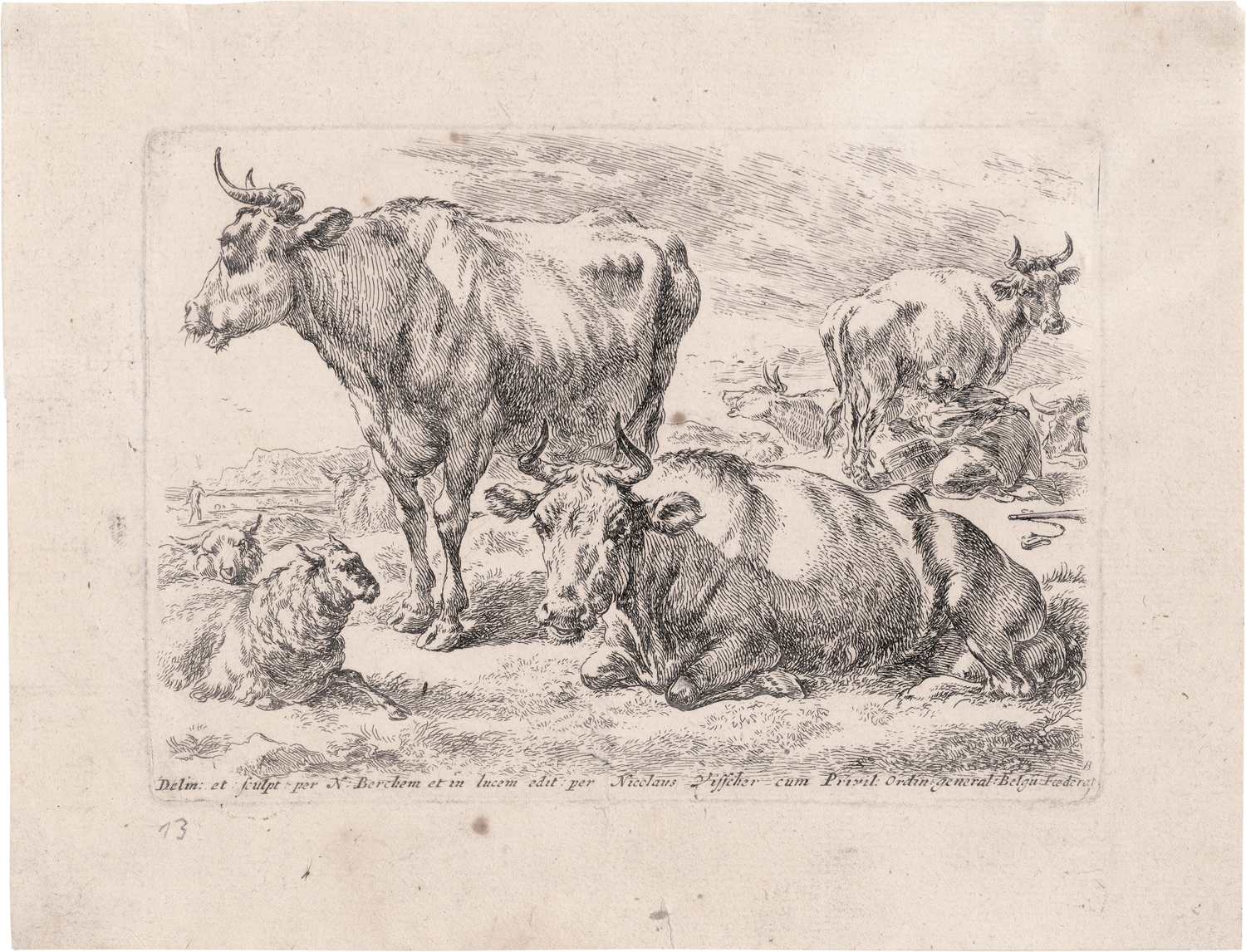 Aus der Folge "Animalia", vollständig vorhanden sind "Die Folge mit den querformatigen Tieren und den beiden Ziegenköpfen", "Die Folge mit den Schafen und der singenden Hirtin", vor Löschung des Buchstaben "c", "Die Folge mit den Schafen (sog. Frauen-Buch)" und "Die Folge mit den Ziegen" ohne das Titelblatt. Sämtlich ausgezeichnete Drucke mit feinem bzw. teils mit schmalem Rand, auch auf die Darstellung geschnitten. Leicht angestaubt und vereinzelt fleckig, nur teilweise gebräunt, einzelnen Gebrauchs- und Handhabungsspuren, sonst insgesamt gut. Beigegeben ein Contre-Épreuve von der Radierung "Liegendes Mutterschaf mit zwei Lämmern" (vgl. Hollstein 42).