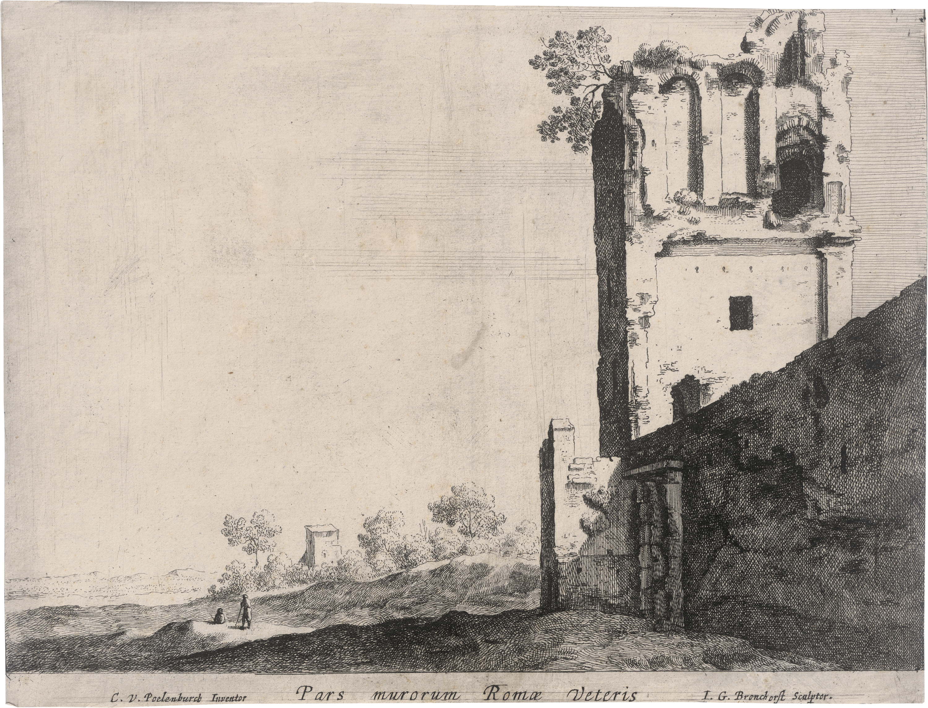 Römische Ruinen. 6 (von 9) Radierungen nach Cornelis van Poelenburgh. 17,9 x 23,4 cm bis 19,3 x 25,1 cm. B. 12-14, 16, 19-20, Hollstein 22-24, 26, 29-30, je II-III (von III). Wz. Siebenzackige Schellenkappe; Bekröntes Lilienwappen mit Nebenmarke.