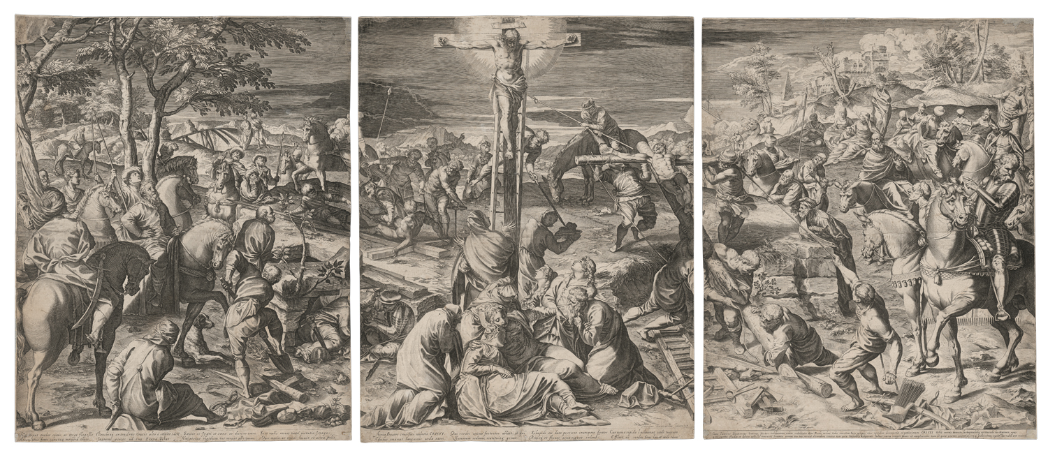 nach. Die Kreuzigung. Kupferstich von 3 Platten auf drei separaten Bogen, nach Tintoretto. Je ca. 50 x 39,8 cm. (1589). Nach B. 23, TIB (Commentary) .157 C2, Bohlin nach 147. Wz. Kreuz zwischen Initialen.