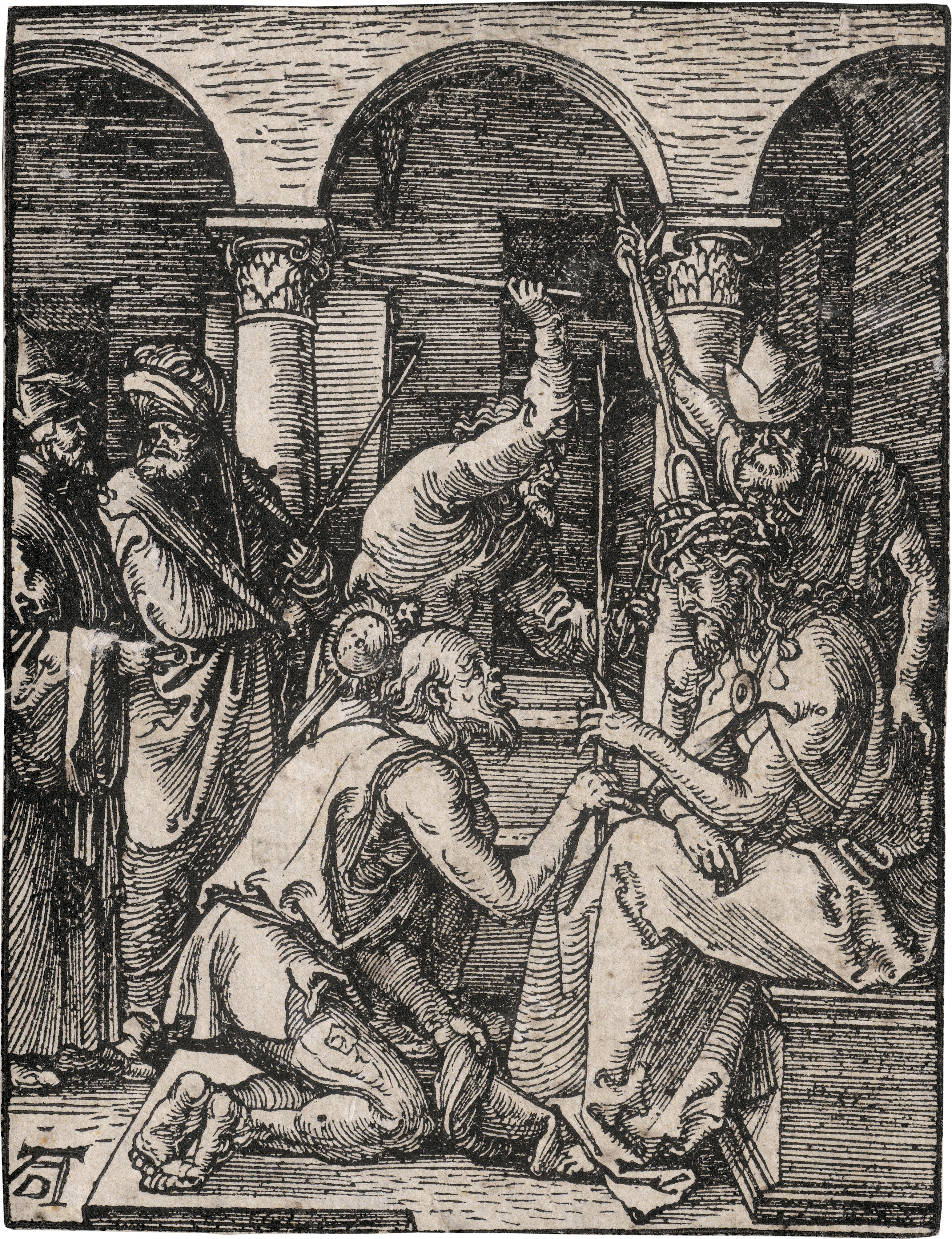 Ausgezeichneter, kräftiger Druck meist an oder auf die Einfassung geschnitten. Minimal fleckig, links geschlossener Randeinriss, weitere sorgsame Ausbesserungen oben rechts, am Rücken des Knienden, im Turbanträger oder unten rechts, weitere Gebrauchsspuren, sonst gut. Beigegeben ebenfalls aus der Kleinen Holzschnittpassion "Verspottung Christi" (Meder 139).